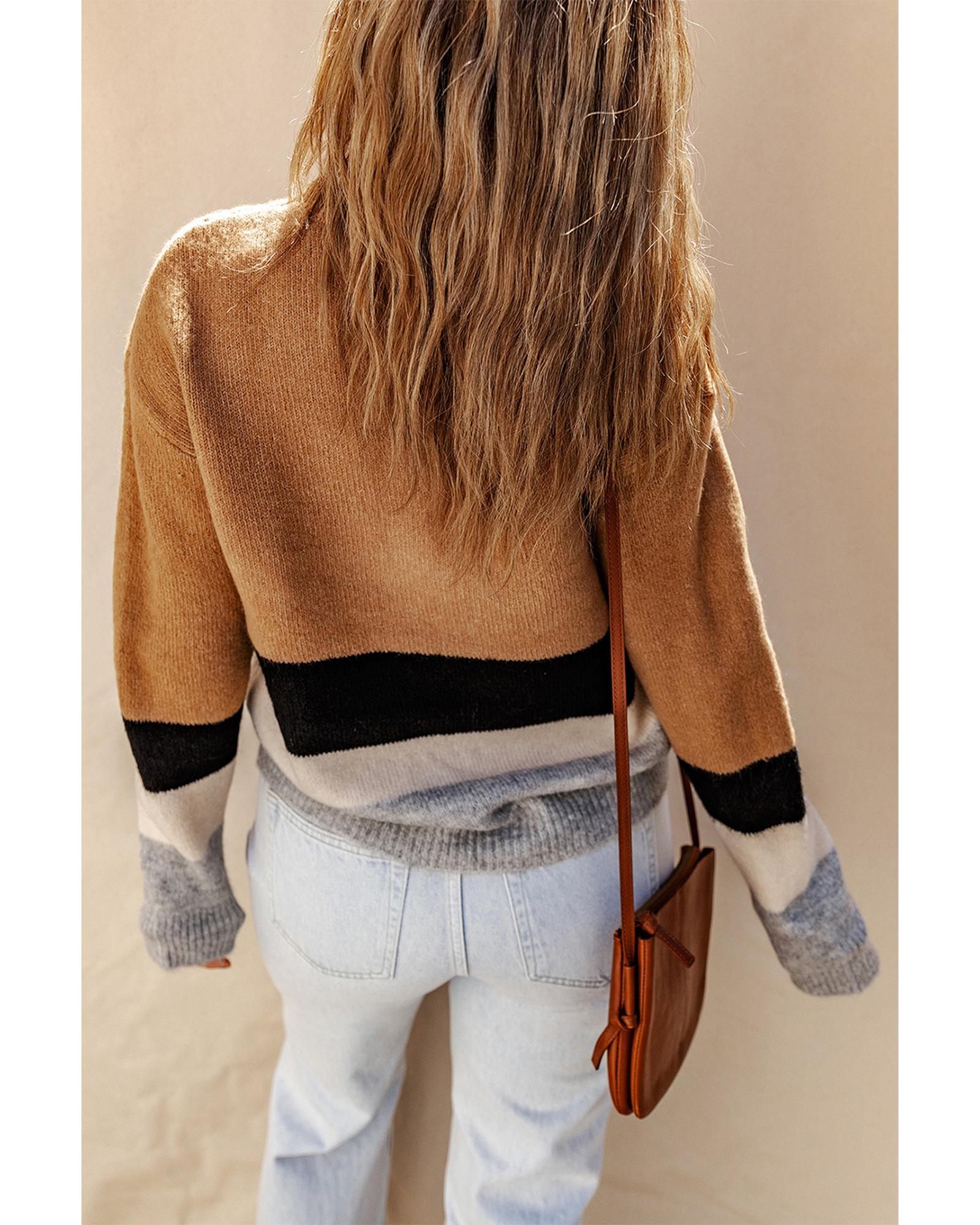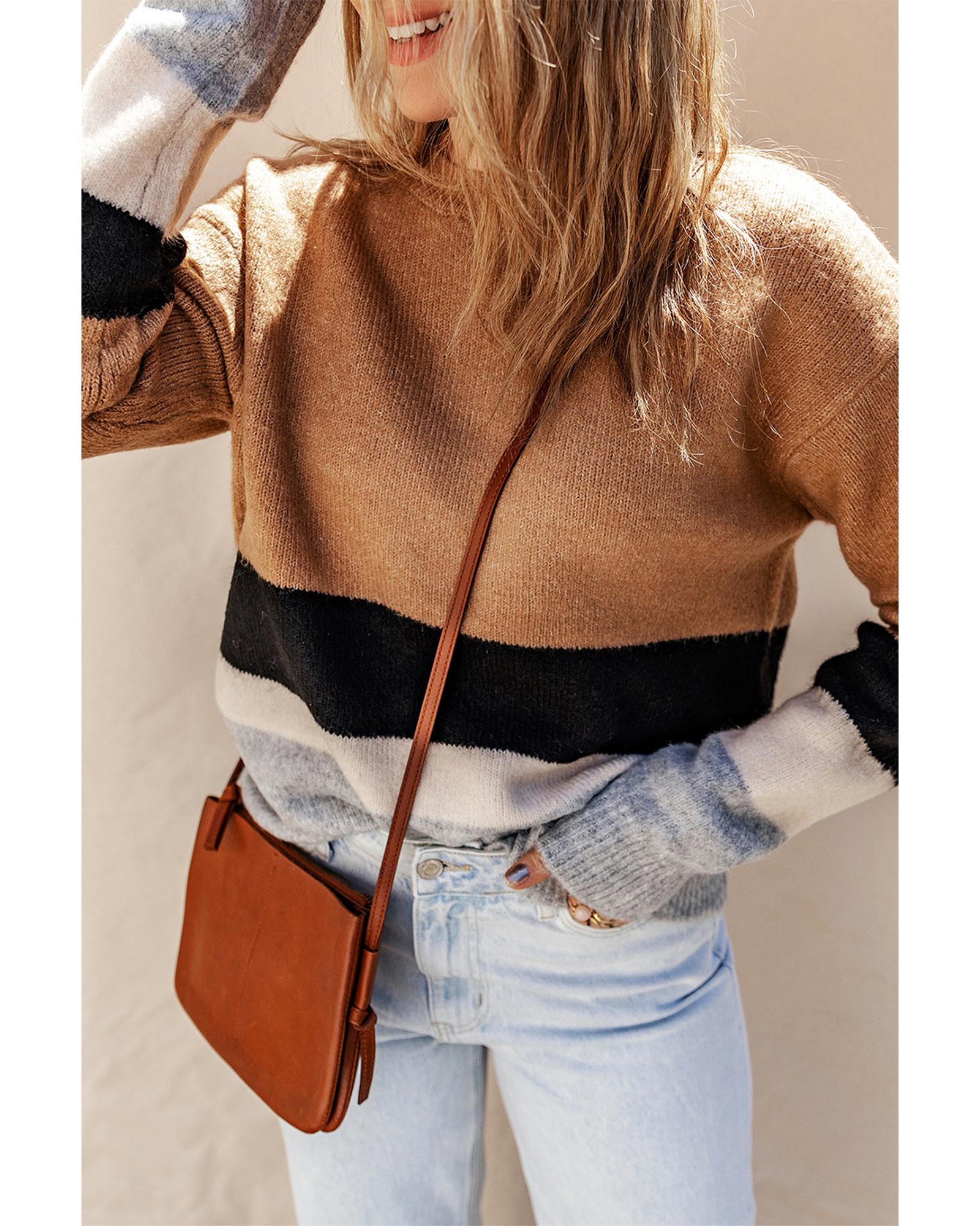 Azura Exchange Brown Color Block Striped Ribbed Knit Sweater – XL