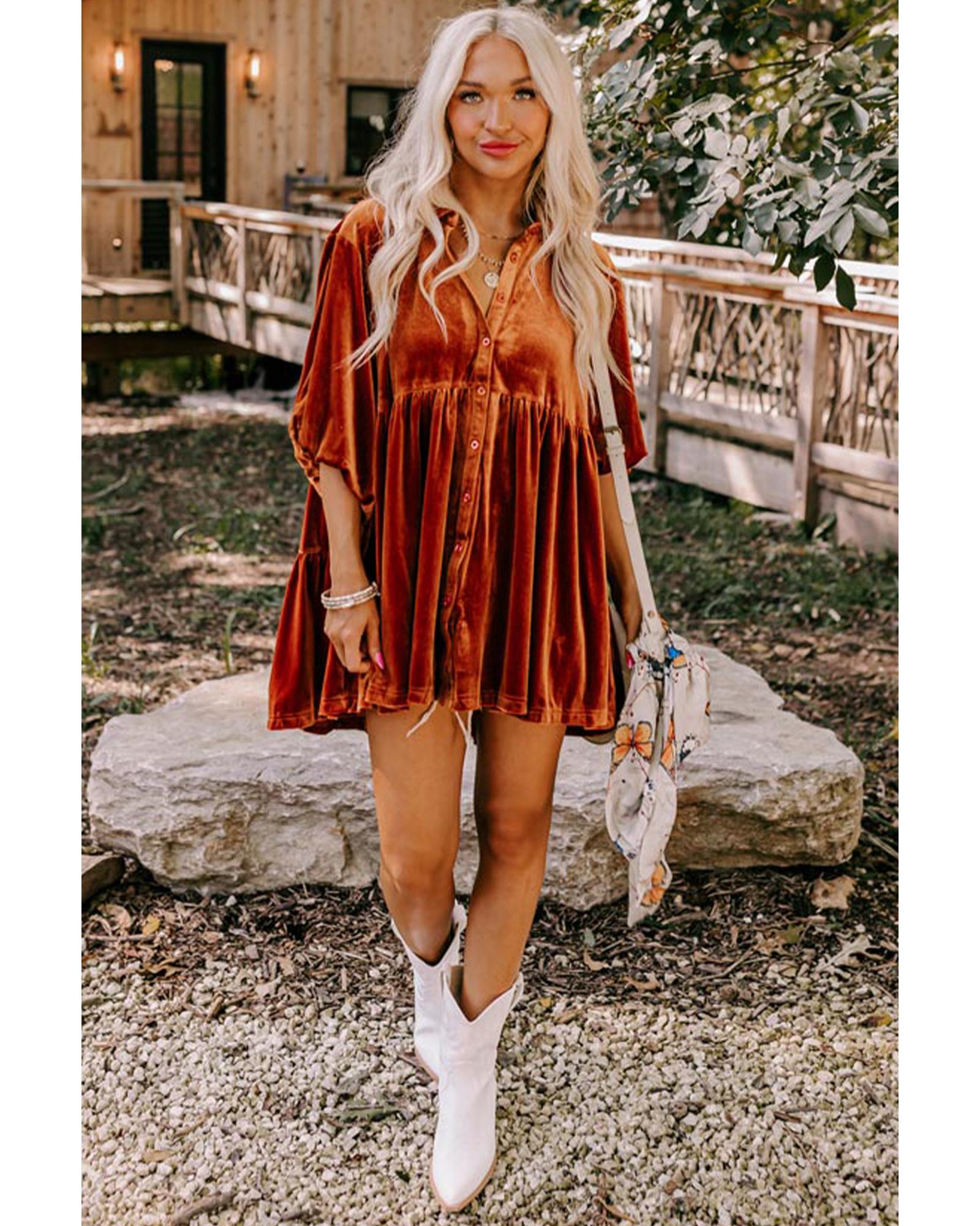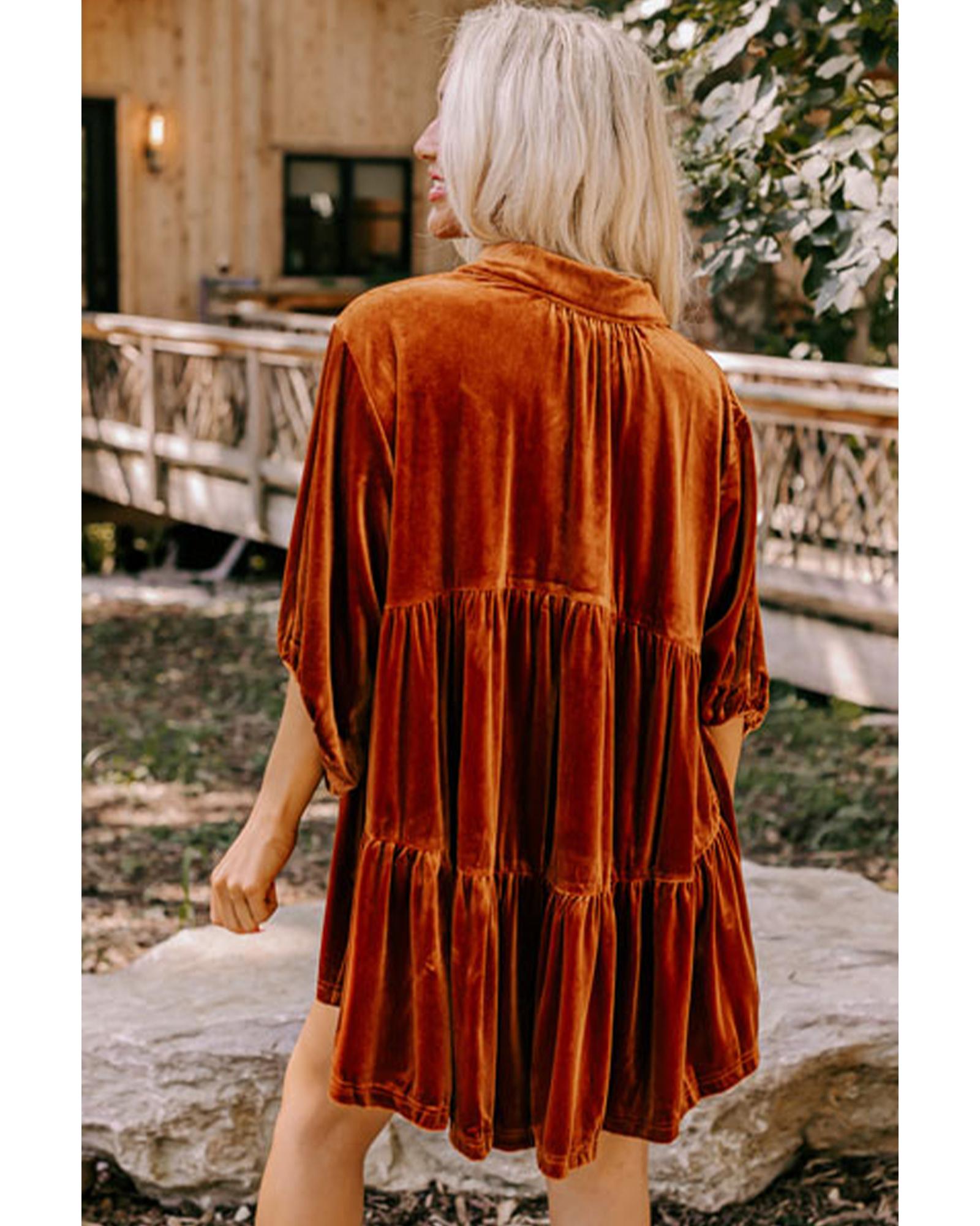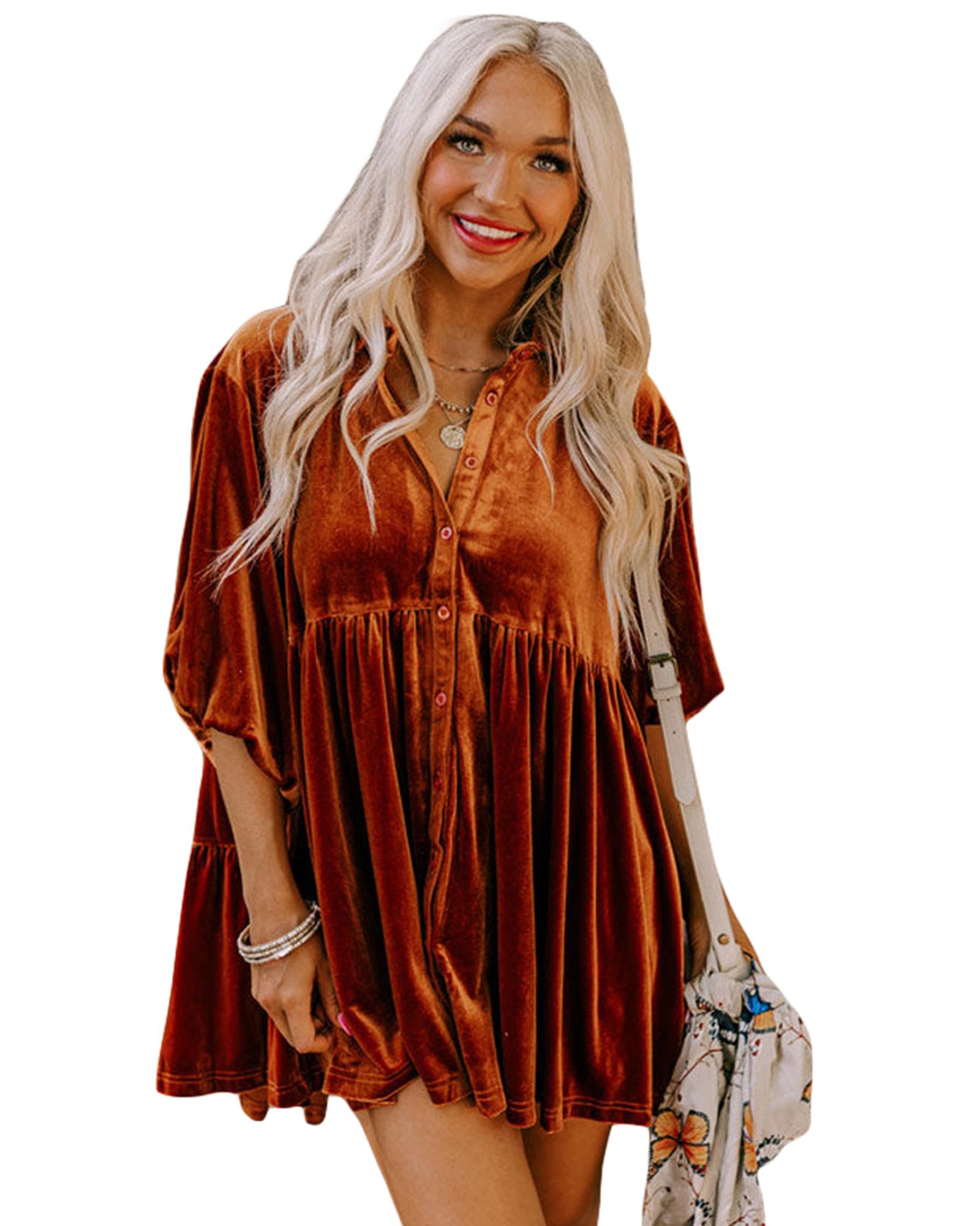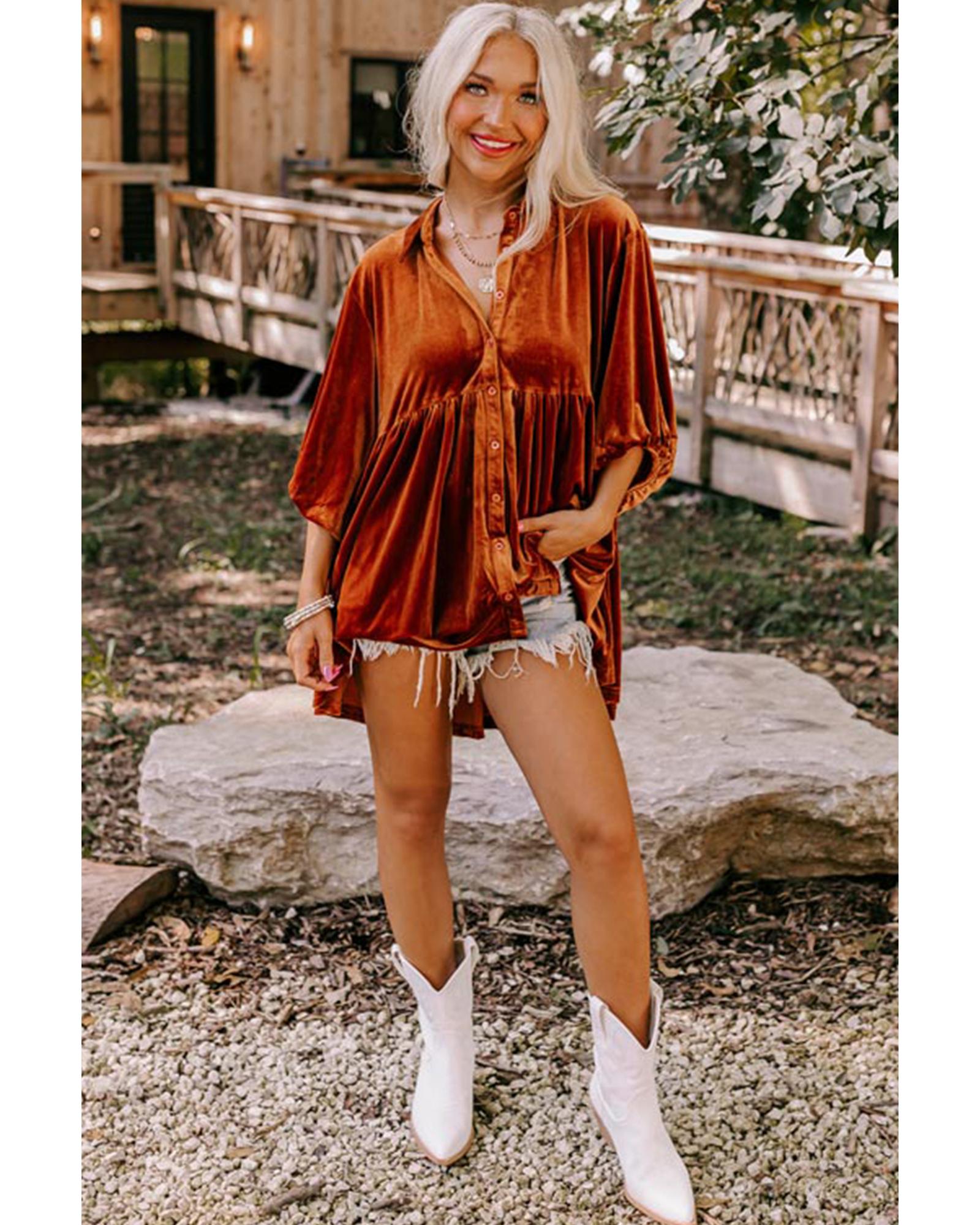Azura Exchange Chestnut 3/4 Sleeve Tunic Babydoll Velvet Shirt – S