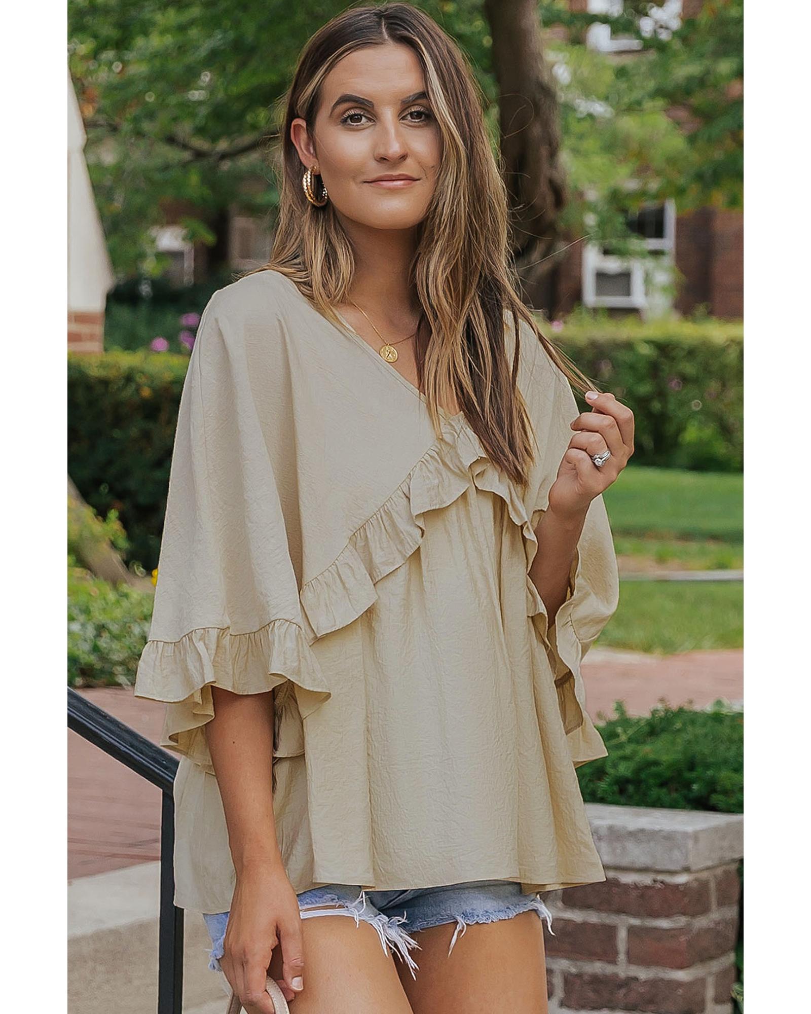 - Stylish and elegant V Neck Draped Batwing Sleeve Ruffle Top