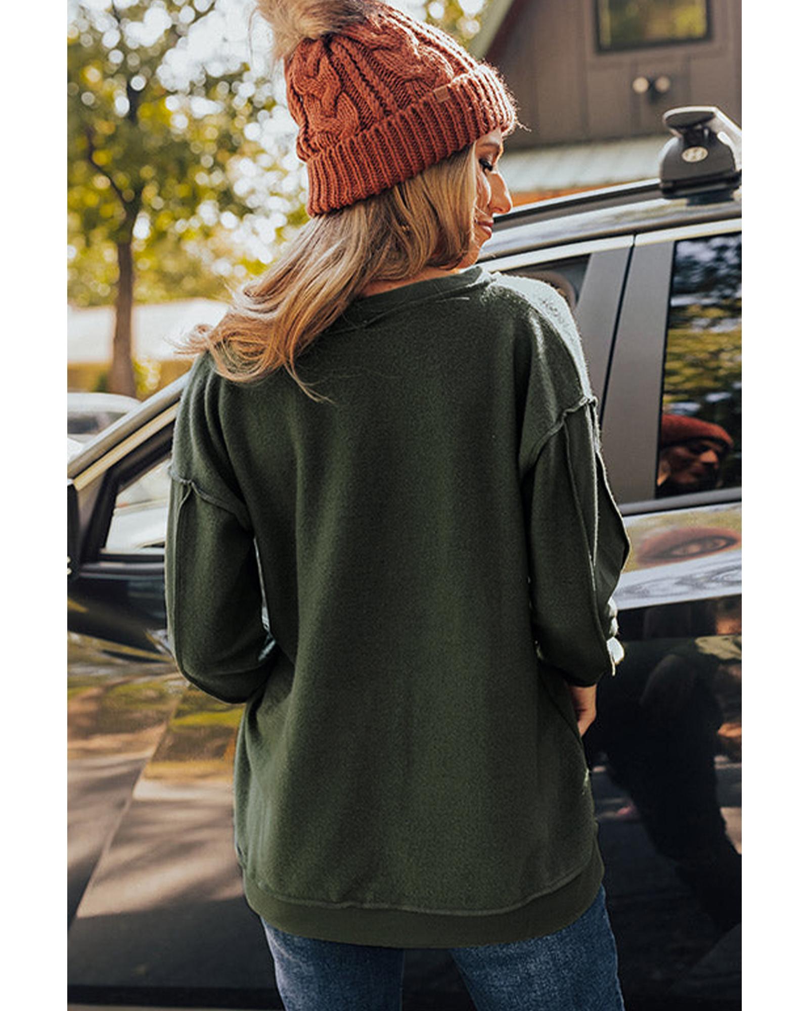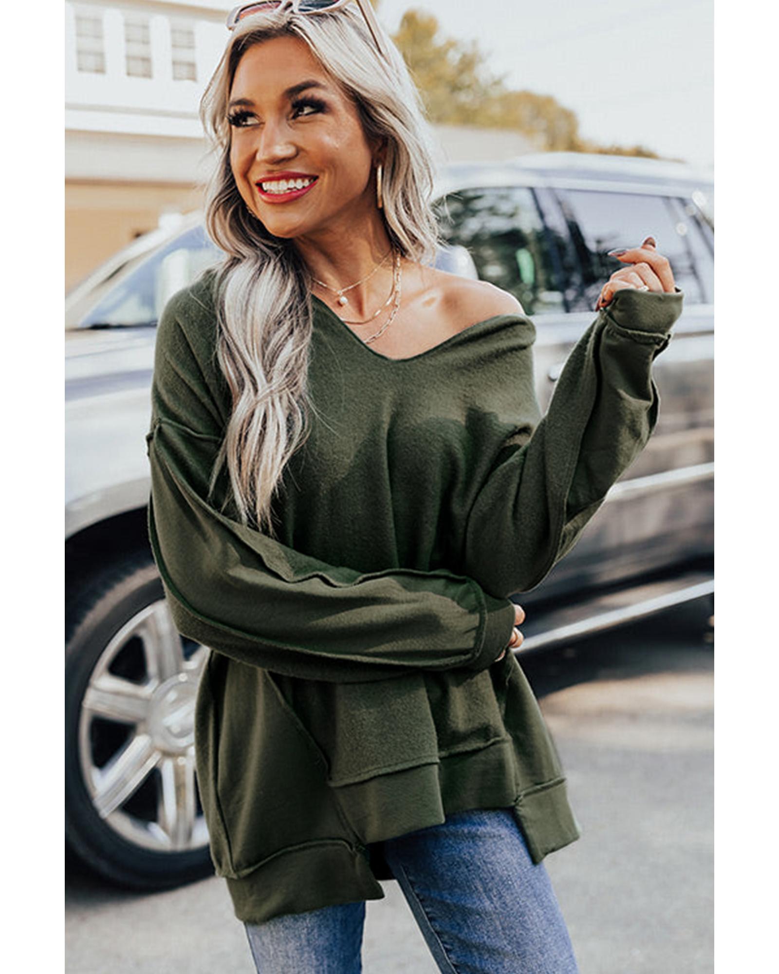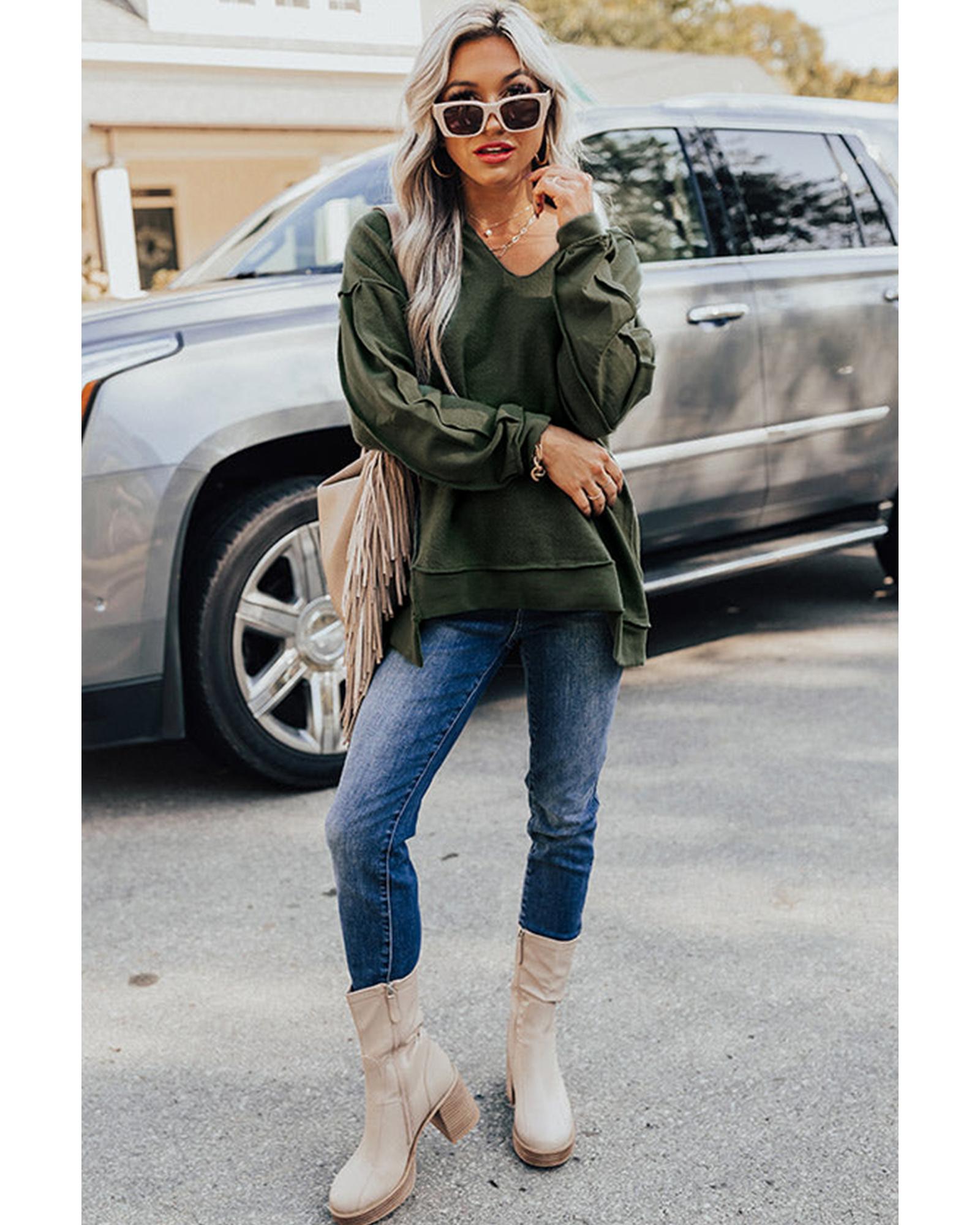 Azura Exchange Exquisite Green Long Sleeve Top with Split Neck and Exposed Seam Detail – L