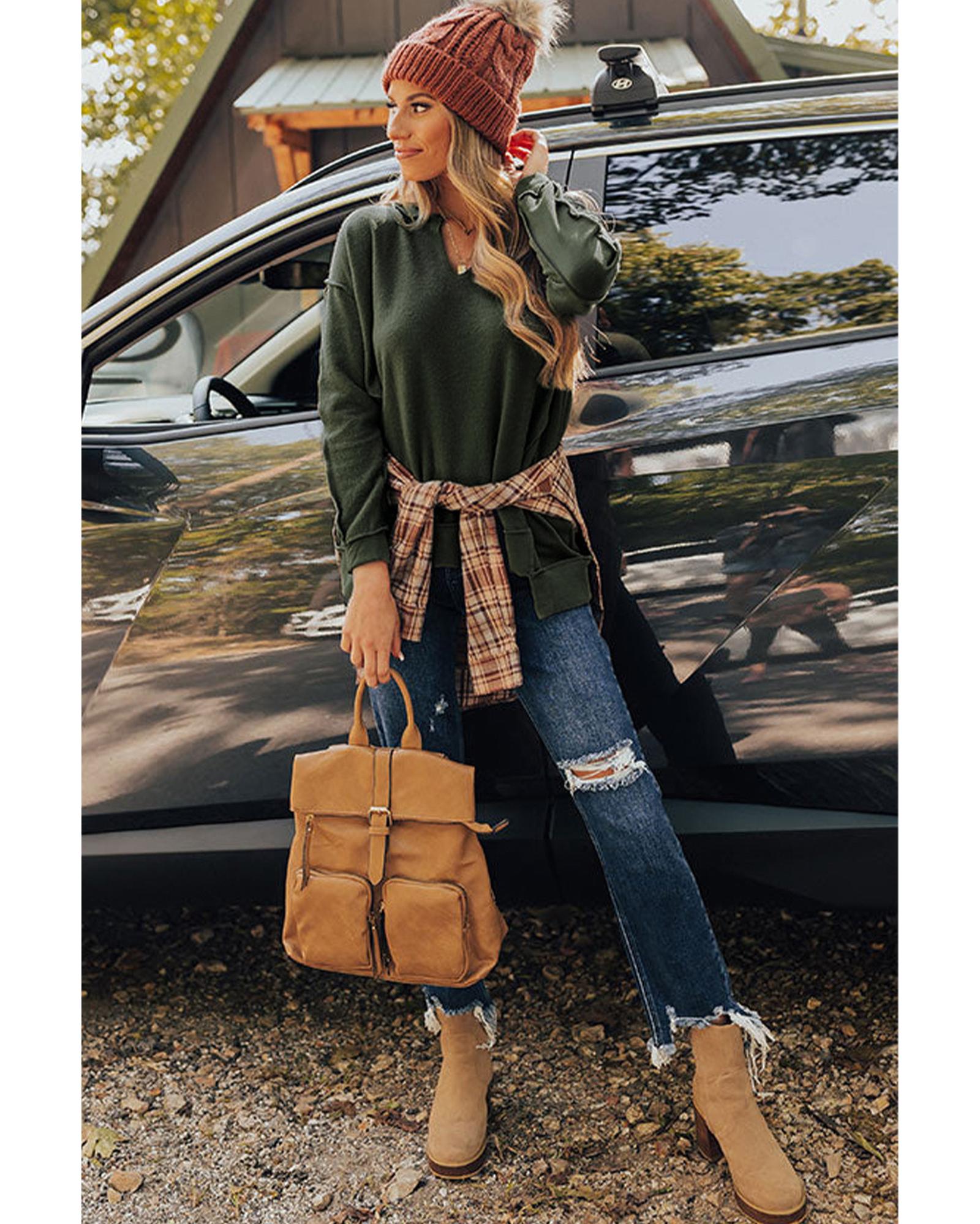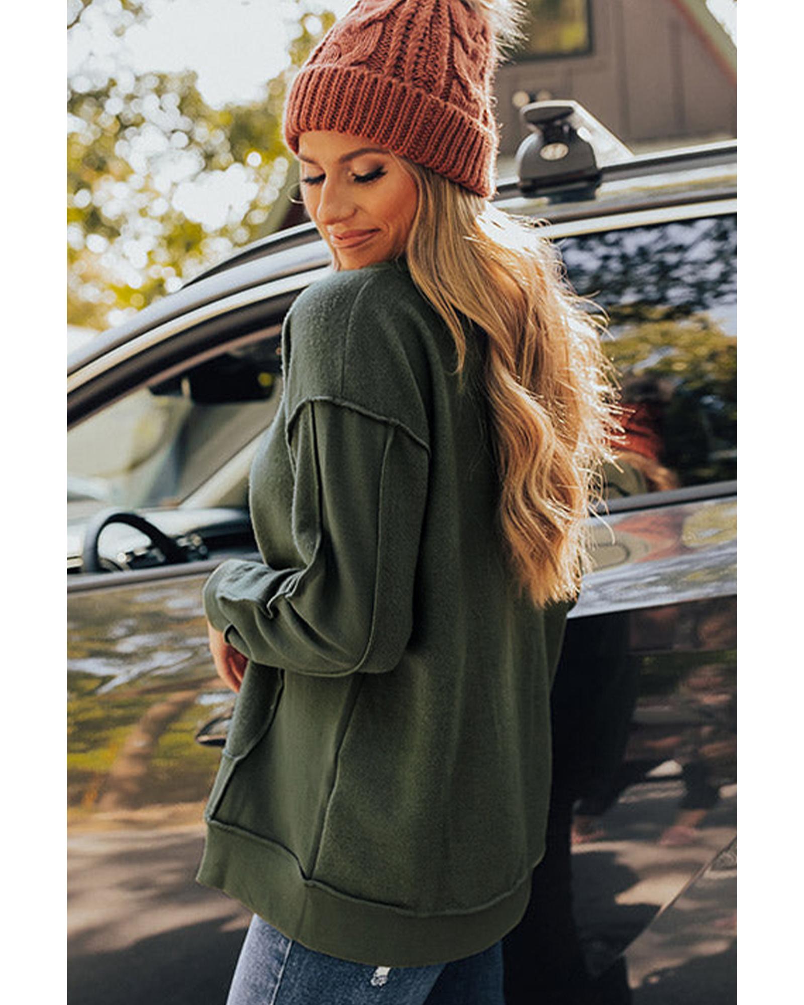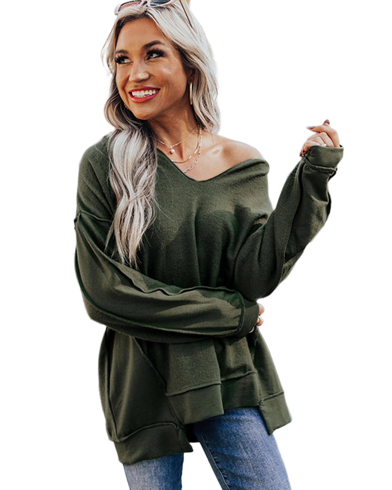 Azura Exchange Exquisite Green Long Sleeve Top with Split Neck and Exposed Seam Detail – L