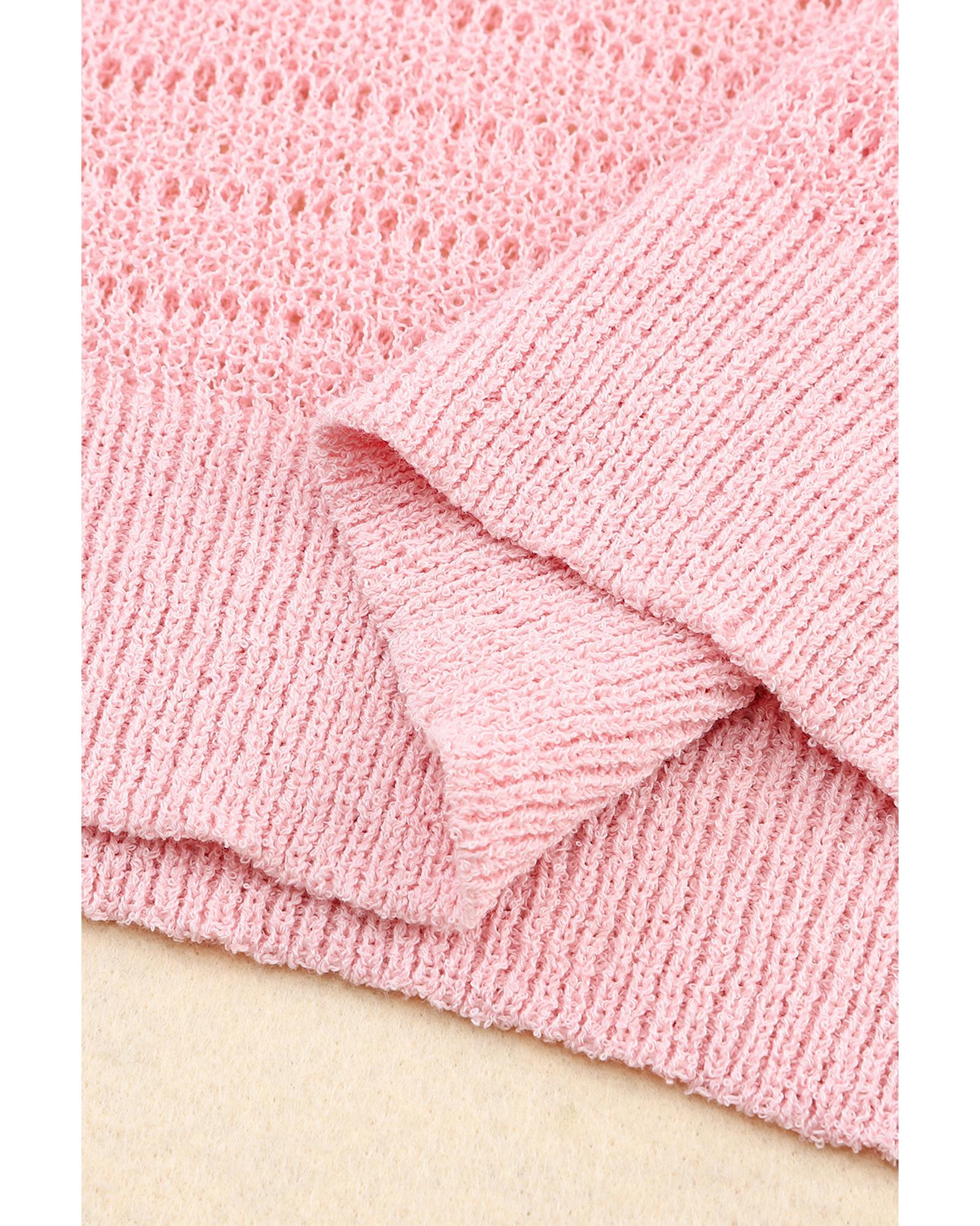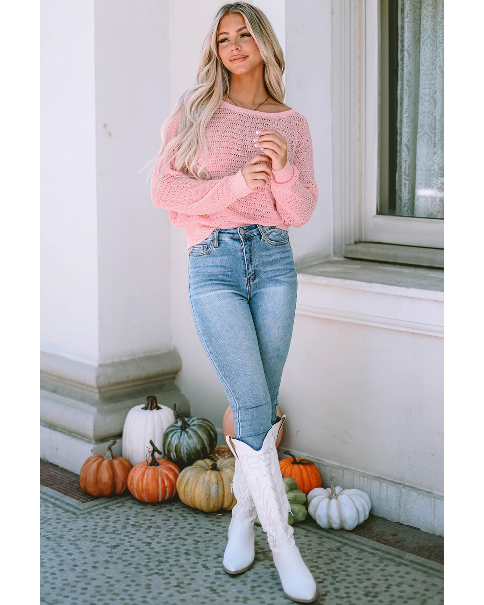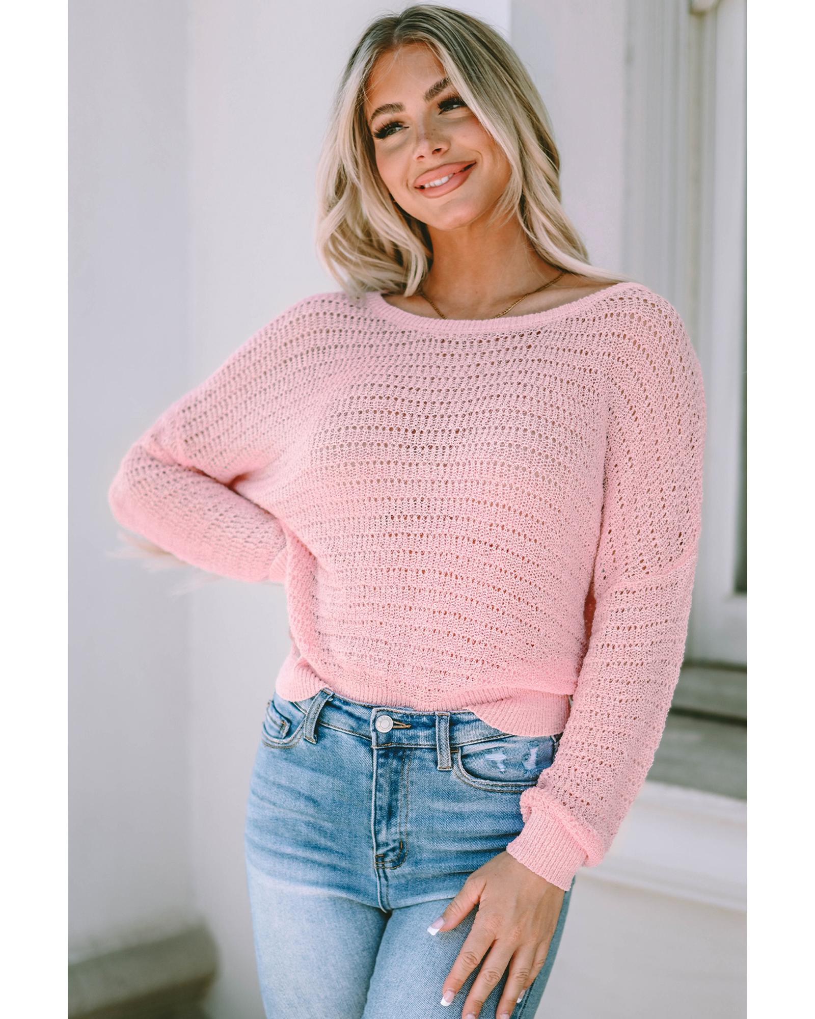 - Knitted Eyelets Round Neck Long Sleeve Top