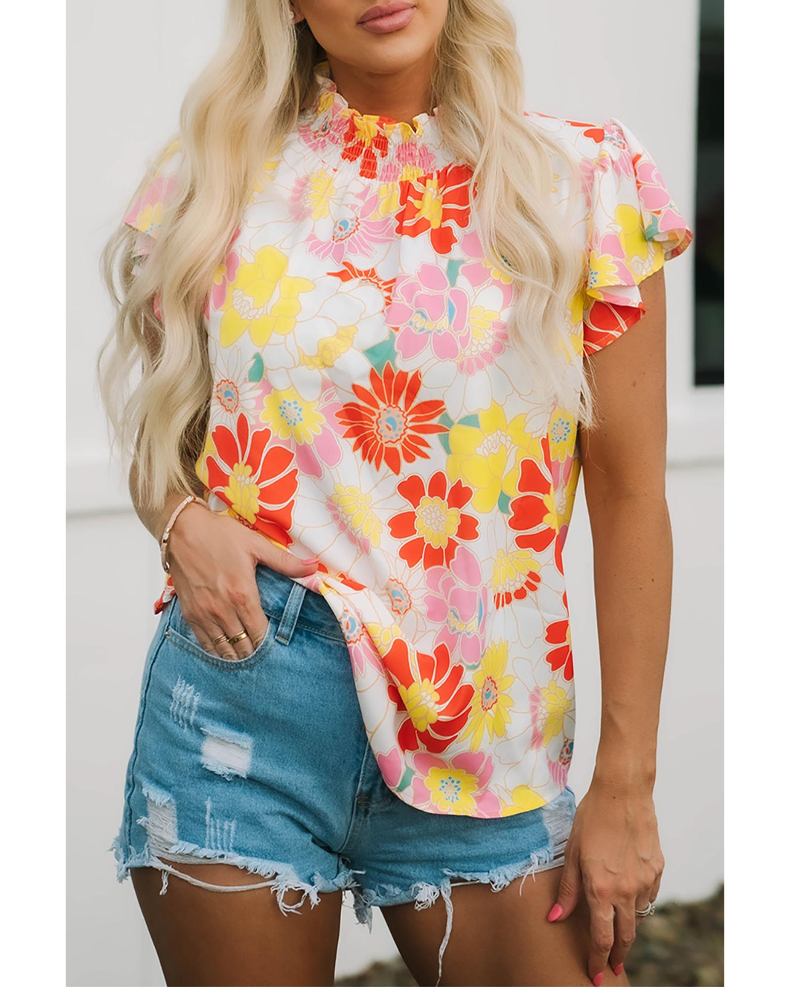 - Multicolor Stand Collar Flutter Sleeves Floral Top