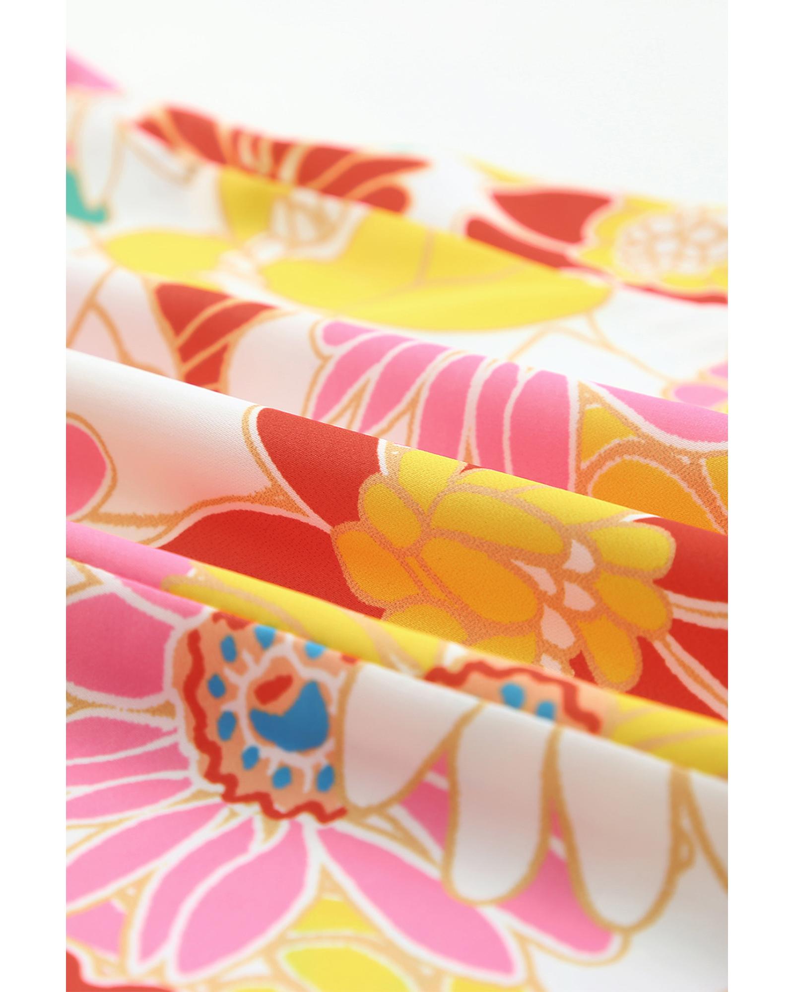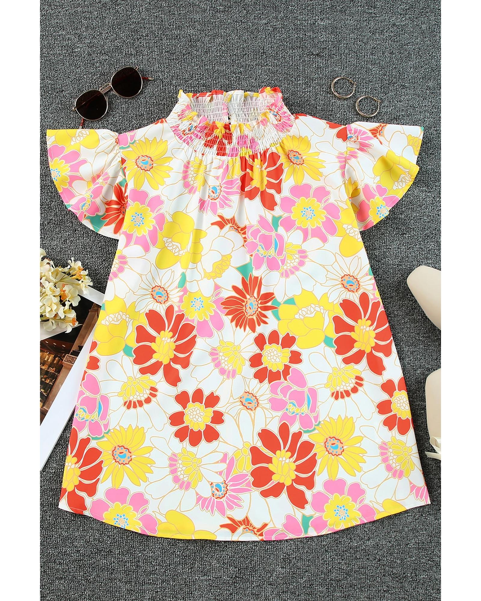 - Multicolor Stand Collar Flutter Sleeves Floral Top
