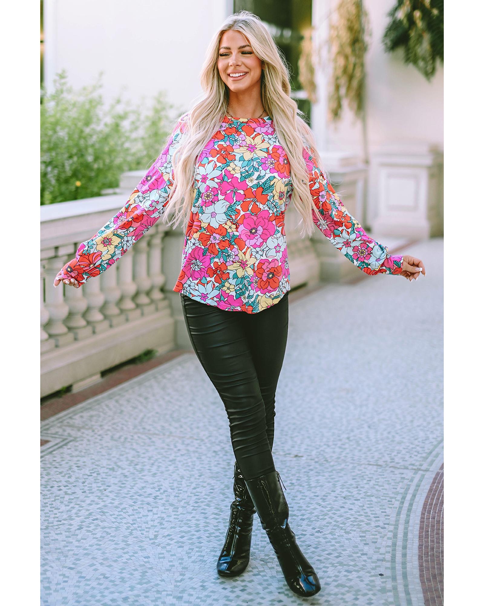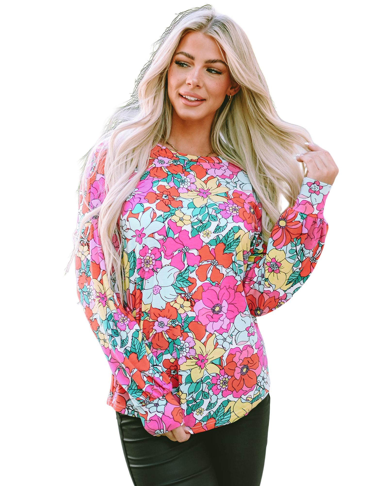 - Multicolor Twisted Hollow-out Back Floral Long Sleeve Top