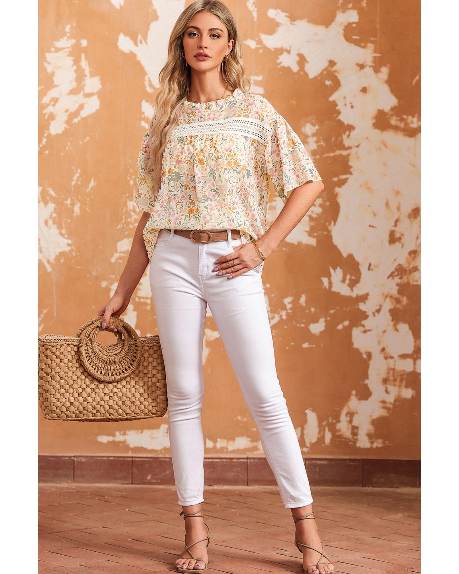 - Multicolor Floral Print Wide Ruffle Sleeves Blouse