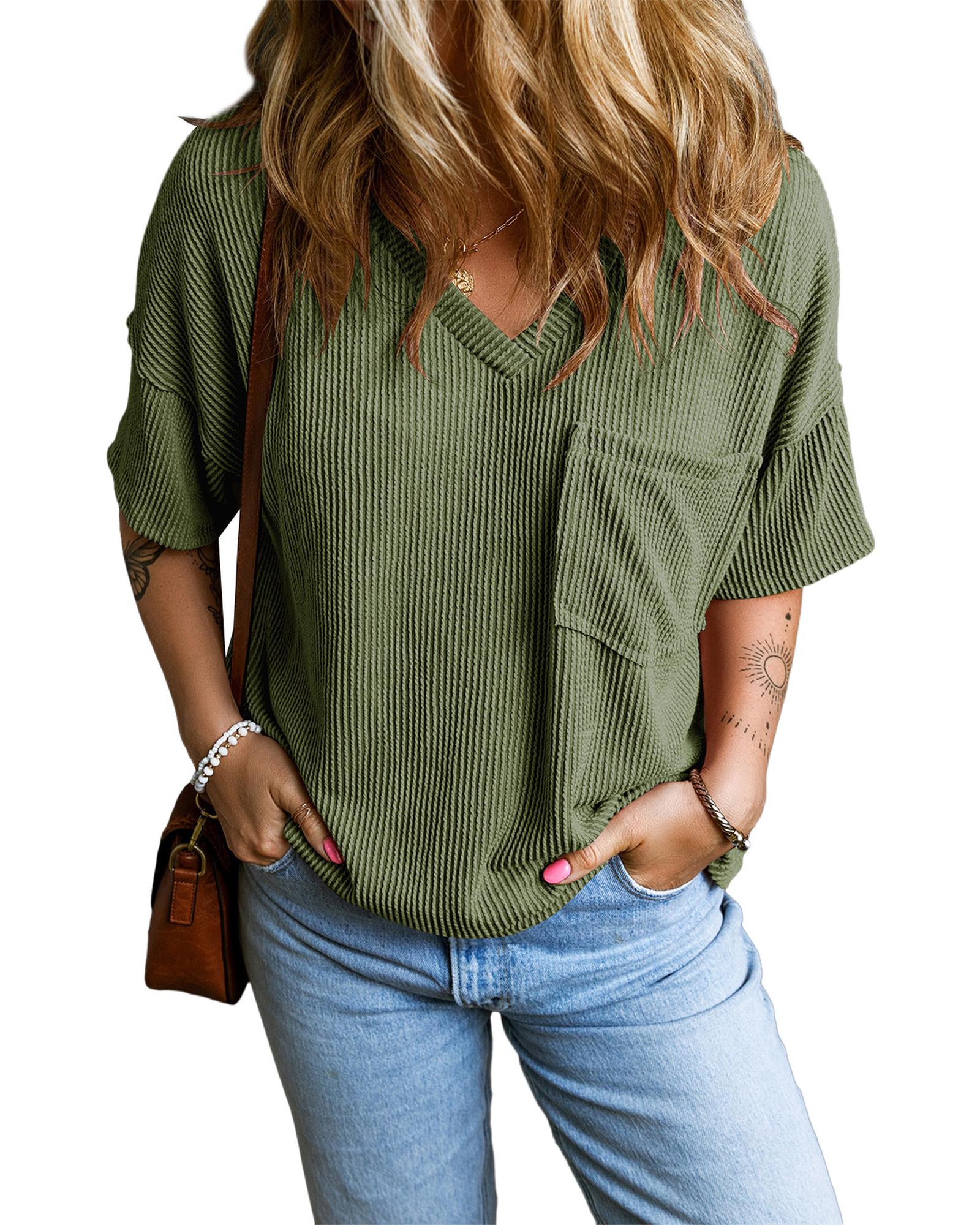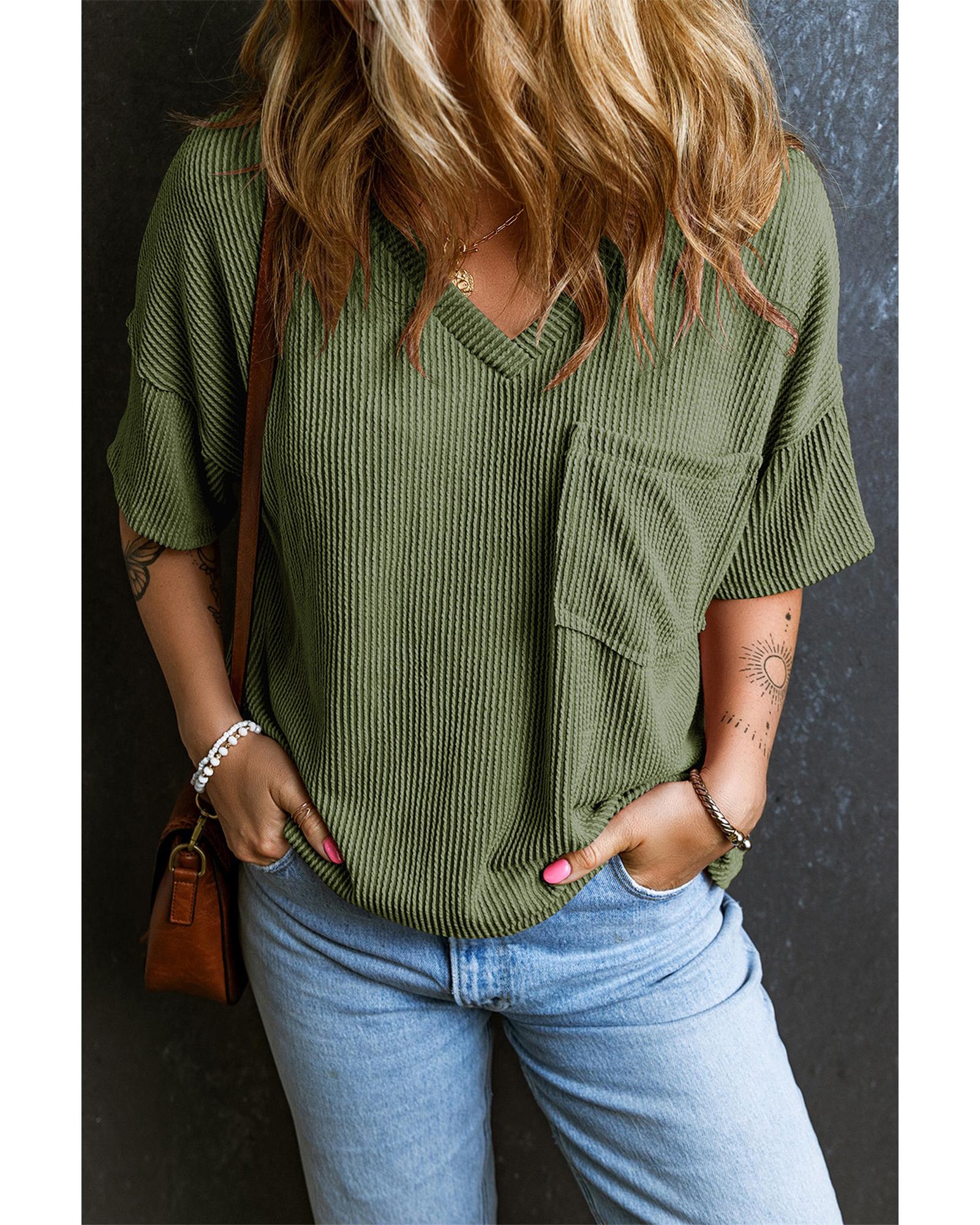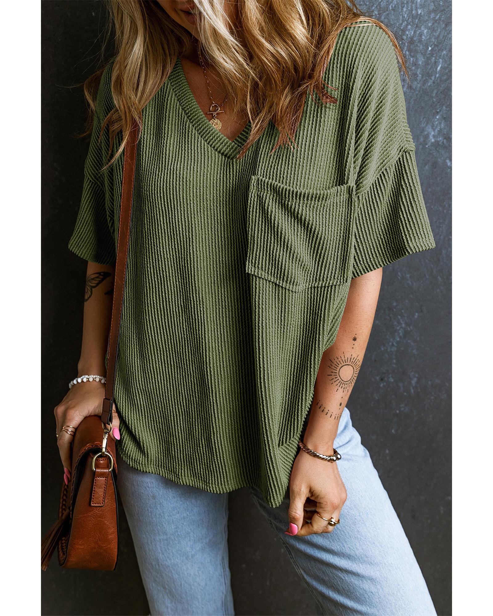Azura Exchange Jungle Green Corded V Neck Chest Pocket Loose T-shirt – XL