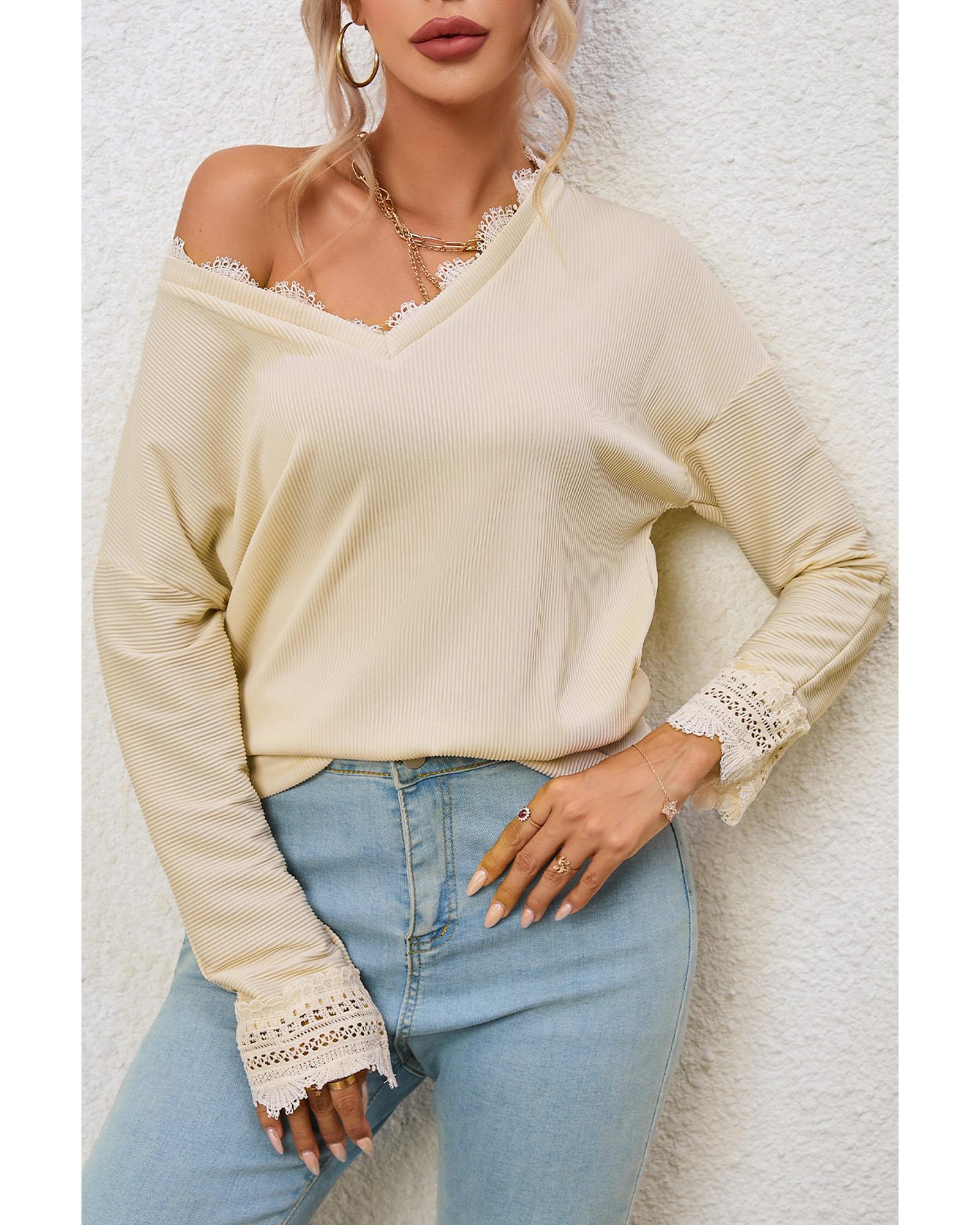 Azura Exchange Lace Trim V Neck Long Sleeve Top – S