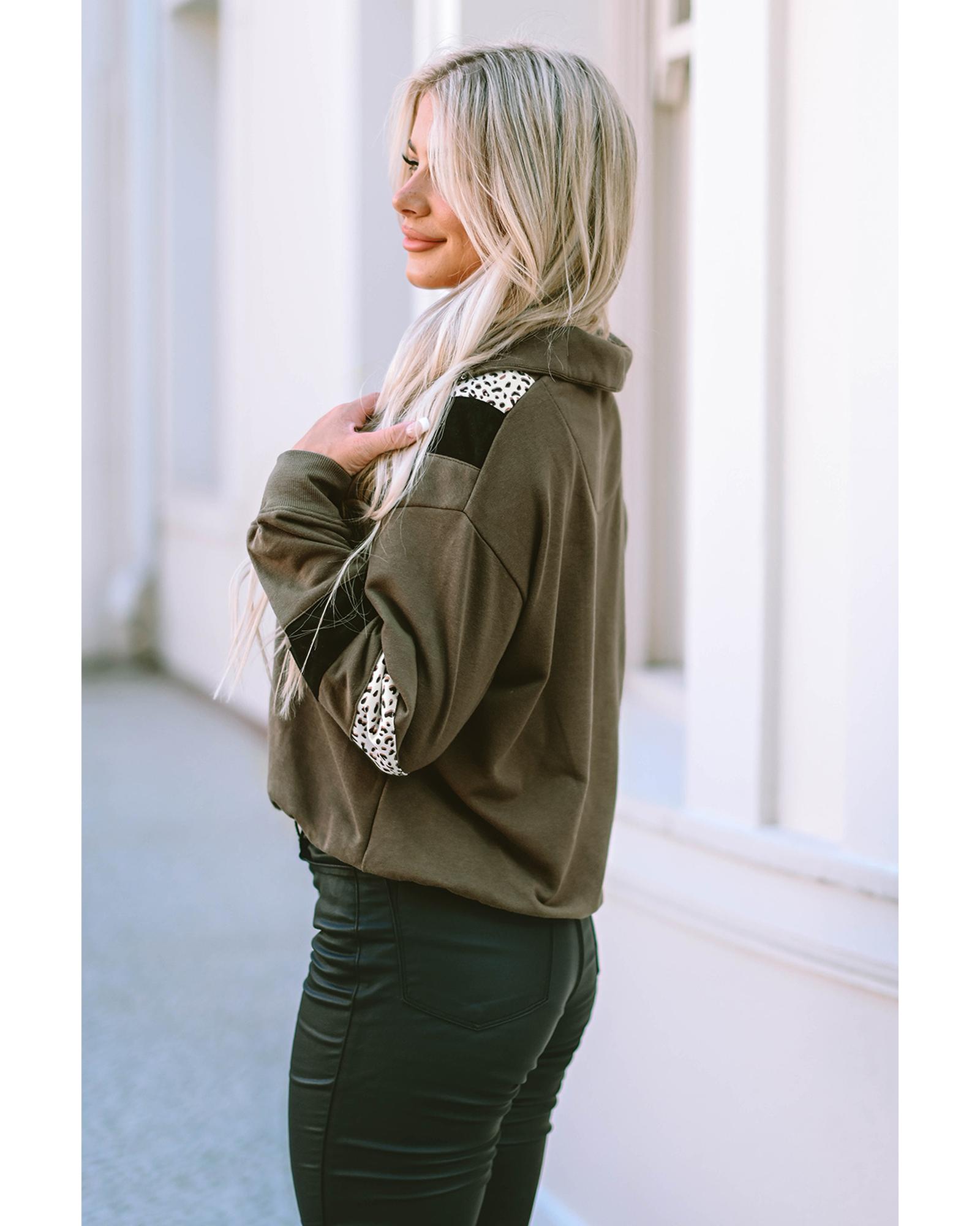 - Green Leopard Contrast Splicing Quarter Zip Sweatshirt