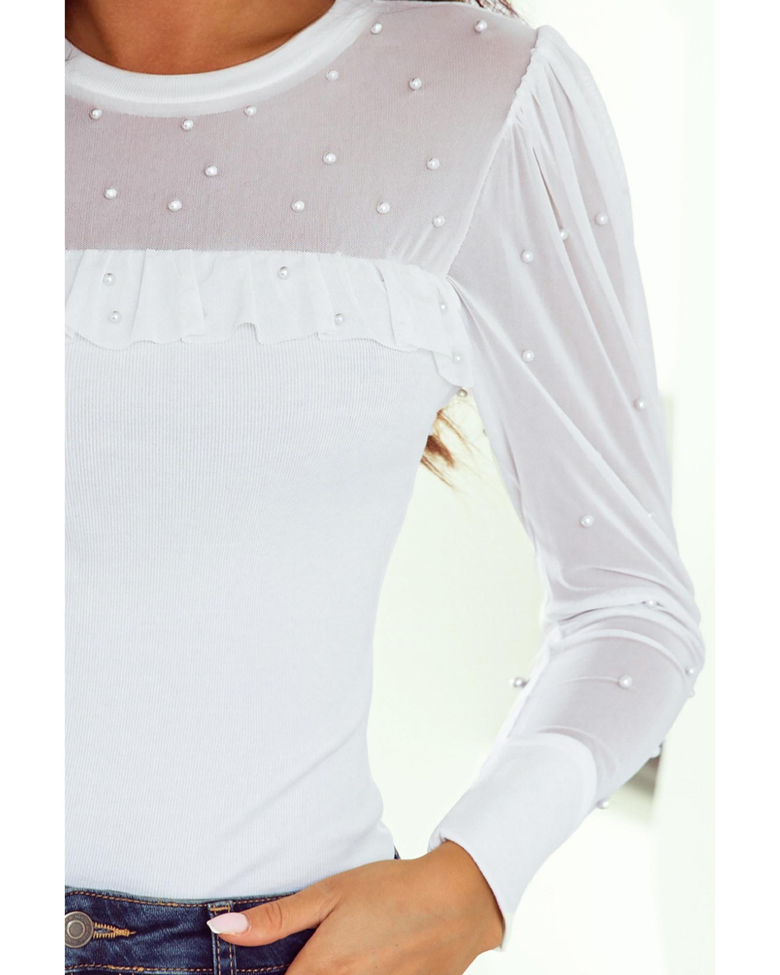 • Stunning Pearl Decor Mesh Patchwork Ribbed Long Sleeve Top