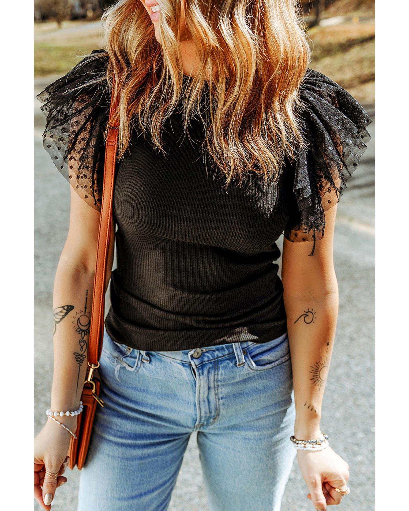 - Womens Dotty Mesh Ruffle Sleeve Ribbed Knit Top