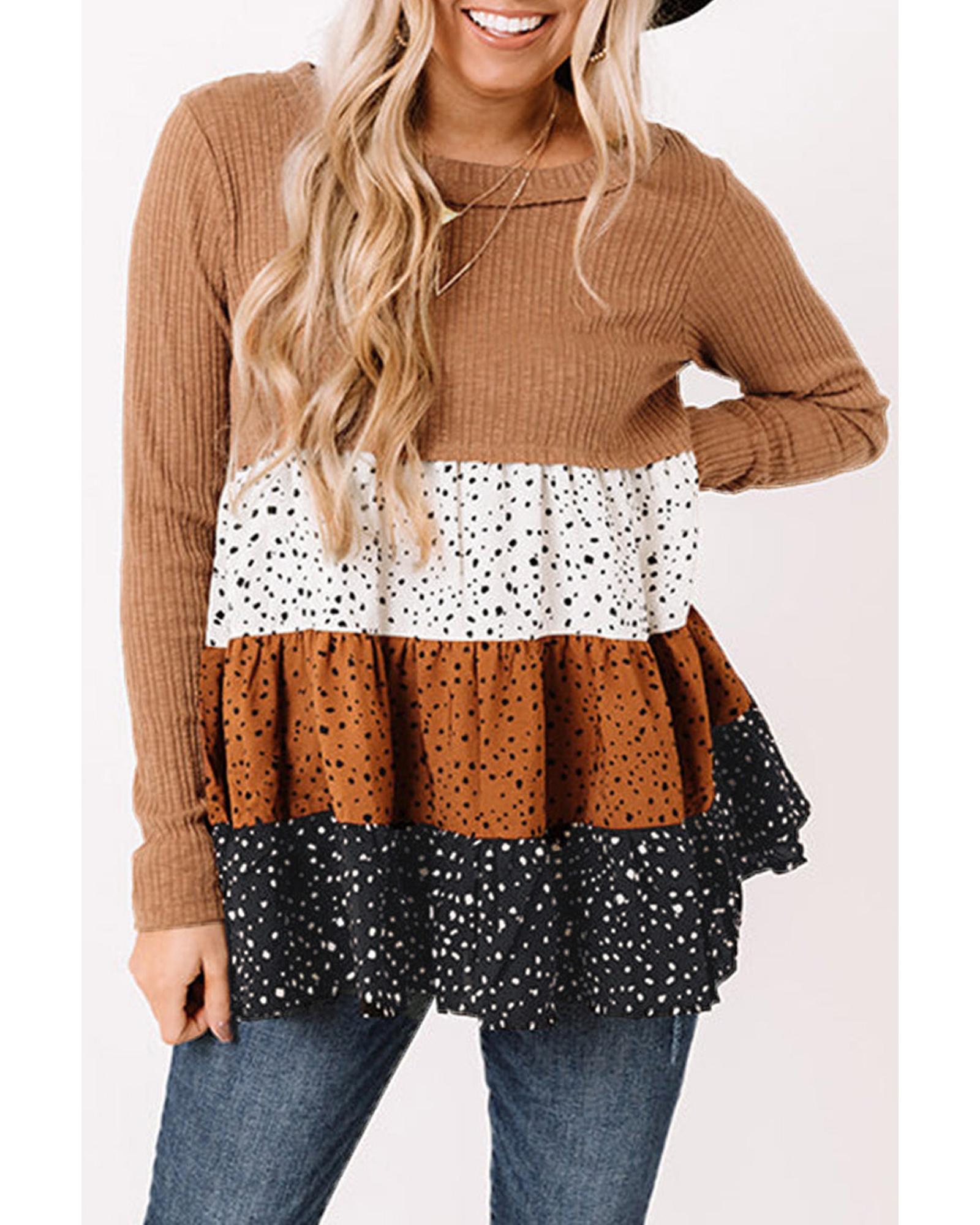 - Luxurious Brown Ribbed Long Sleeve Dotted Tiered Ruffled Flowy Top