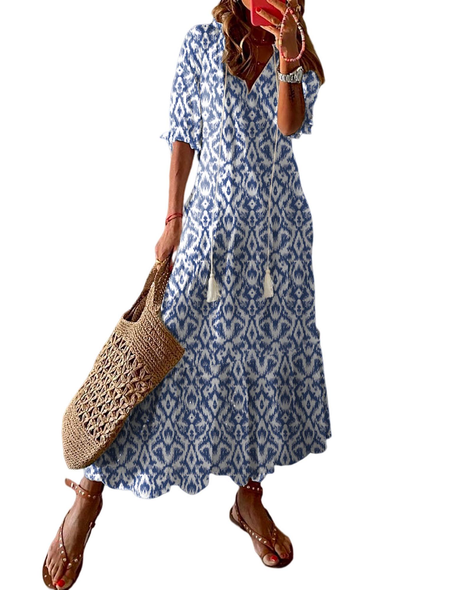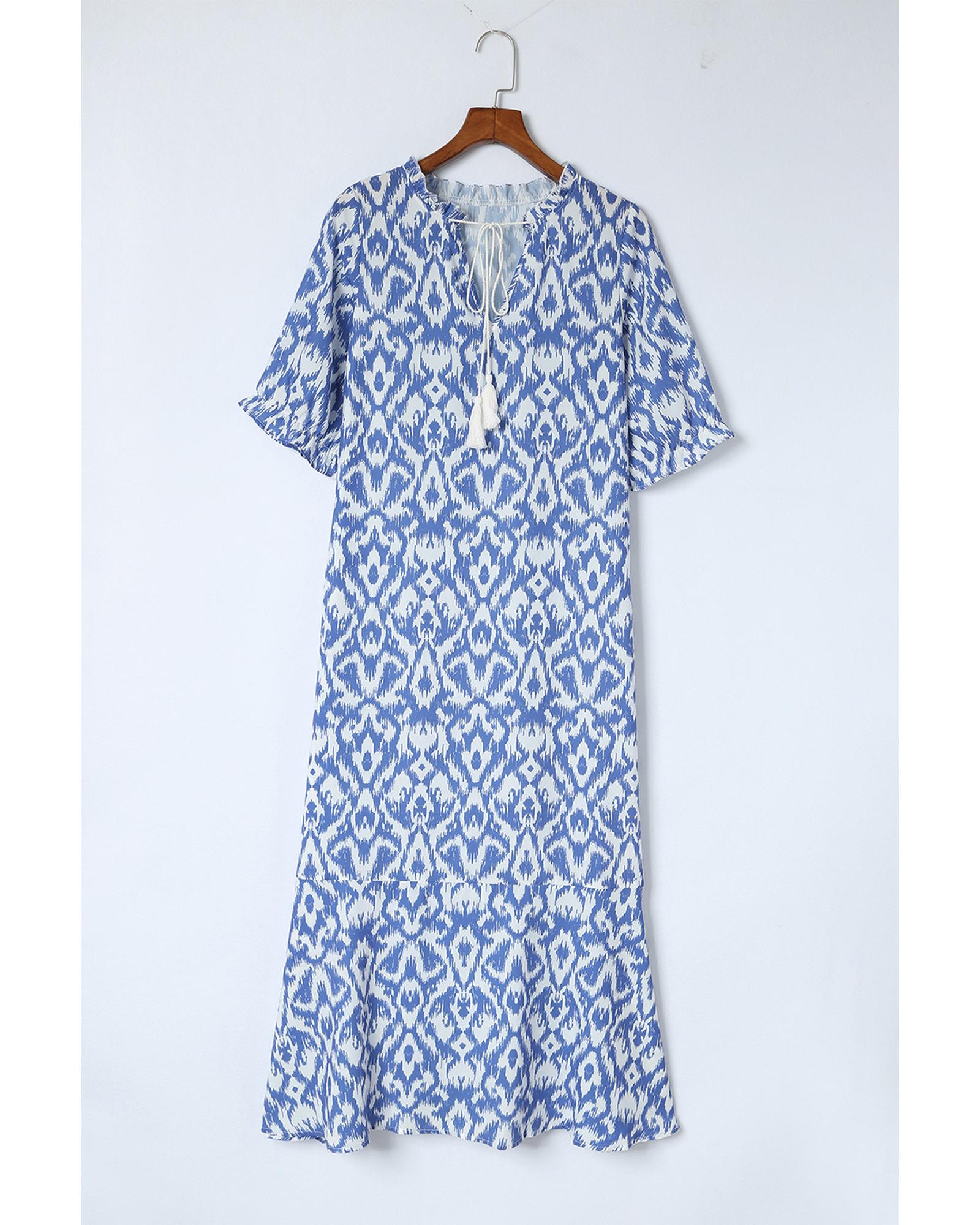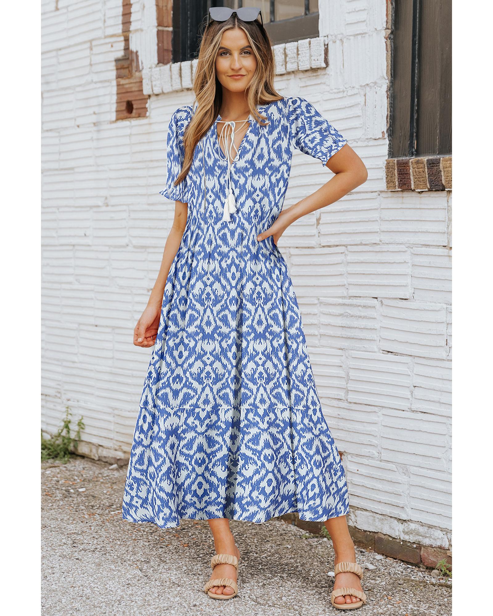 Azura Exchange Sky Blue V Neck Casual Geometric Print Maxi Dress – S