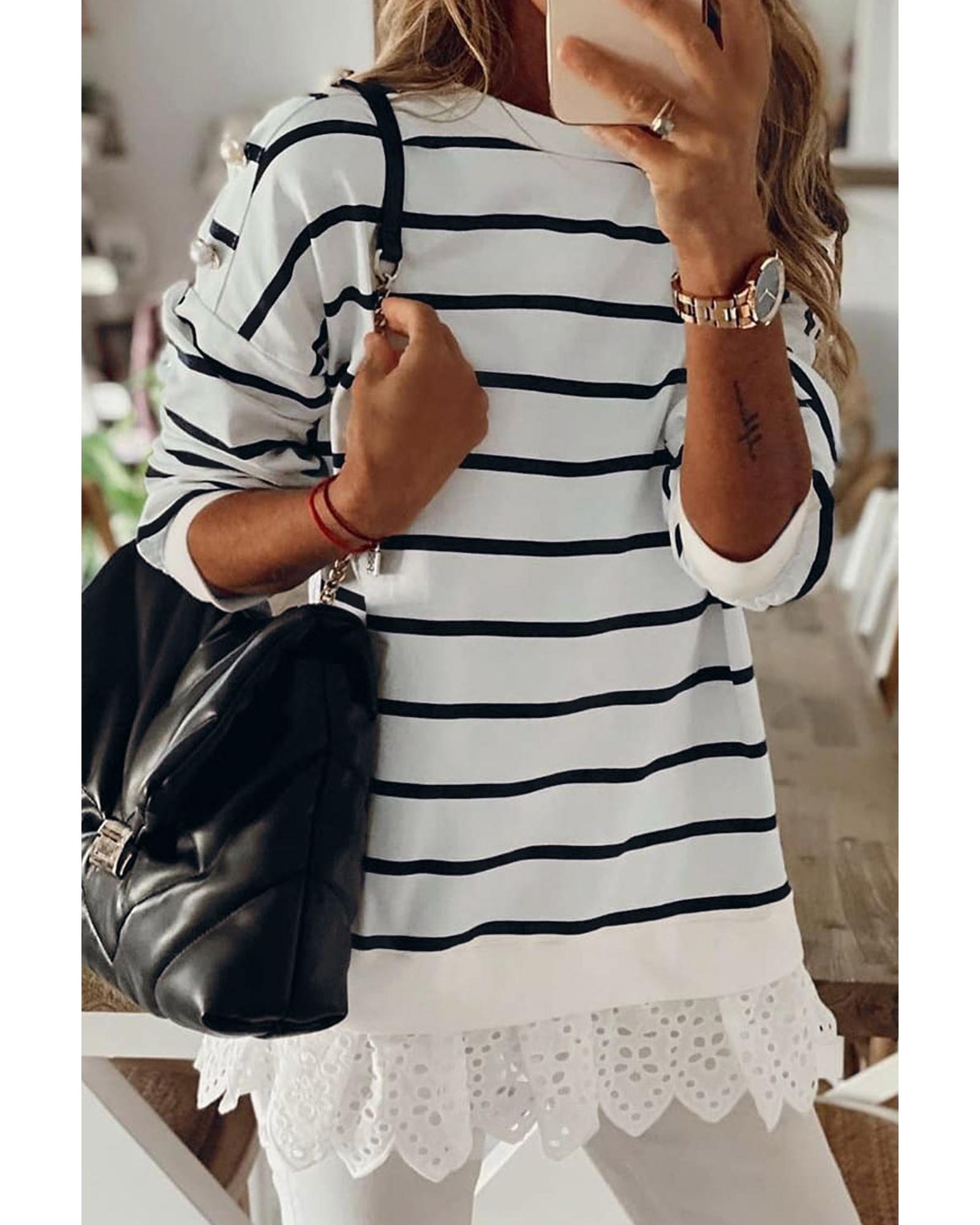 • Versatile and stylish White Striped Button Dropped Shoulder Lace Splicing Top