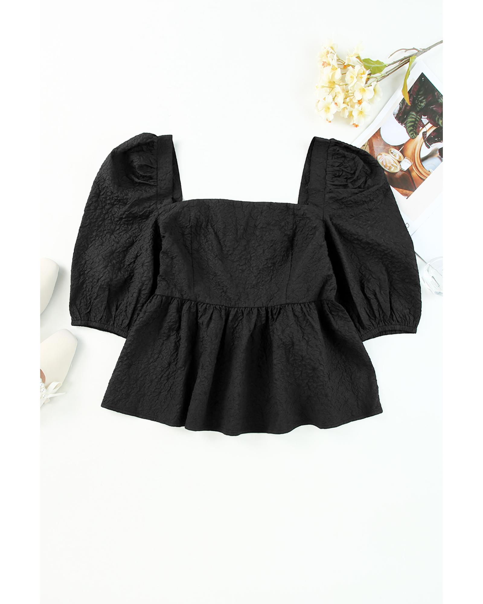 - Luxurious and stylish Textured Square Neck Puff Sleeve Peplum Blouse