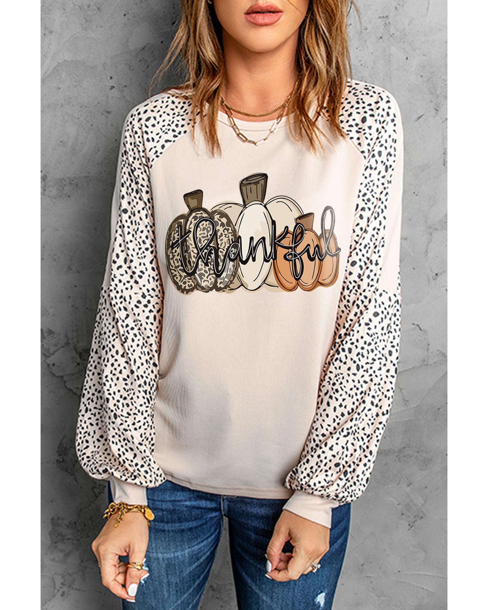 - Stylish and trendy Khaki Thankful Pumpkin Leopard Print Long Sleeve Top