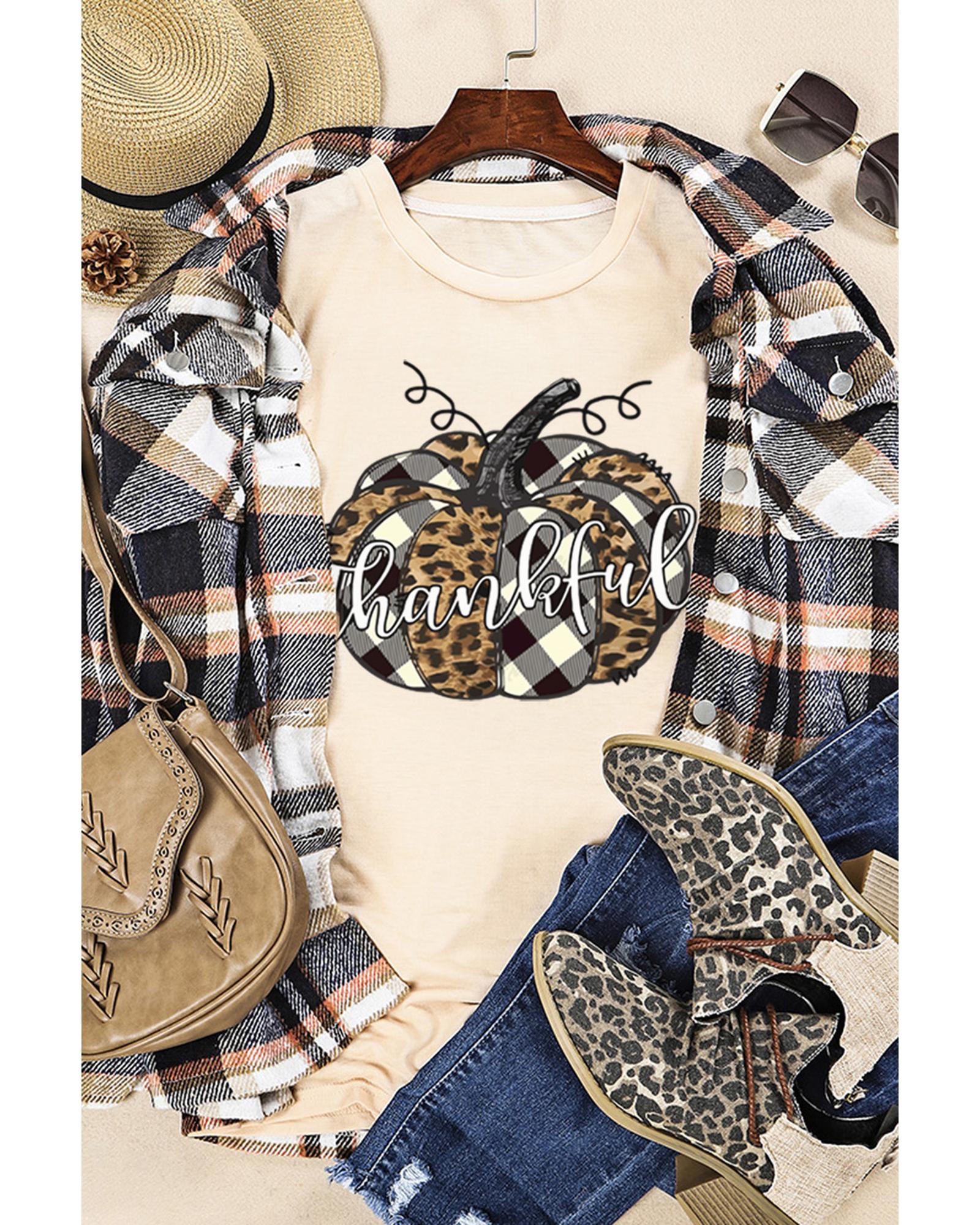 - Khaki Thankful Pumpkin Plaid Print Crewneck Graphic Tee