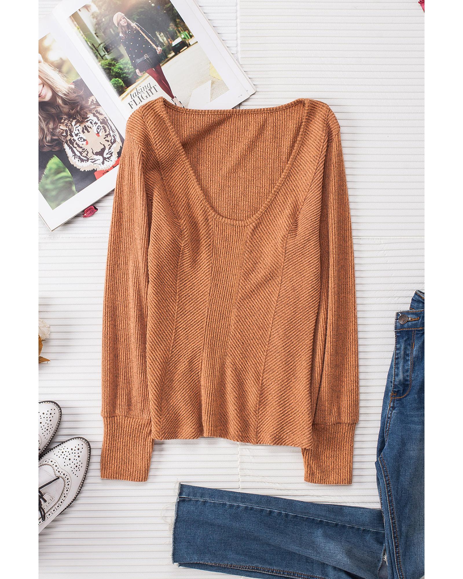 - Brown U Neck Textured Long Sleeve Top