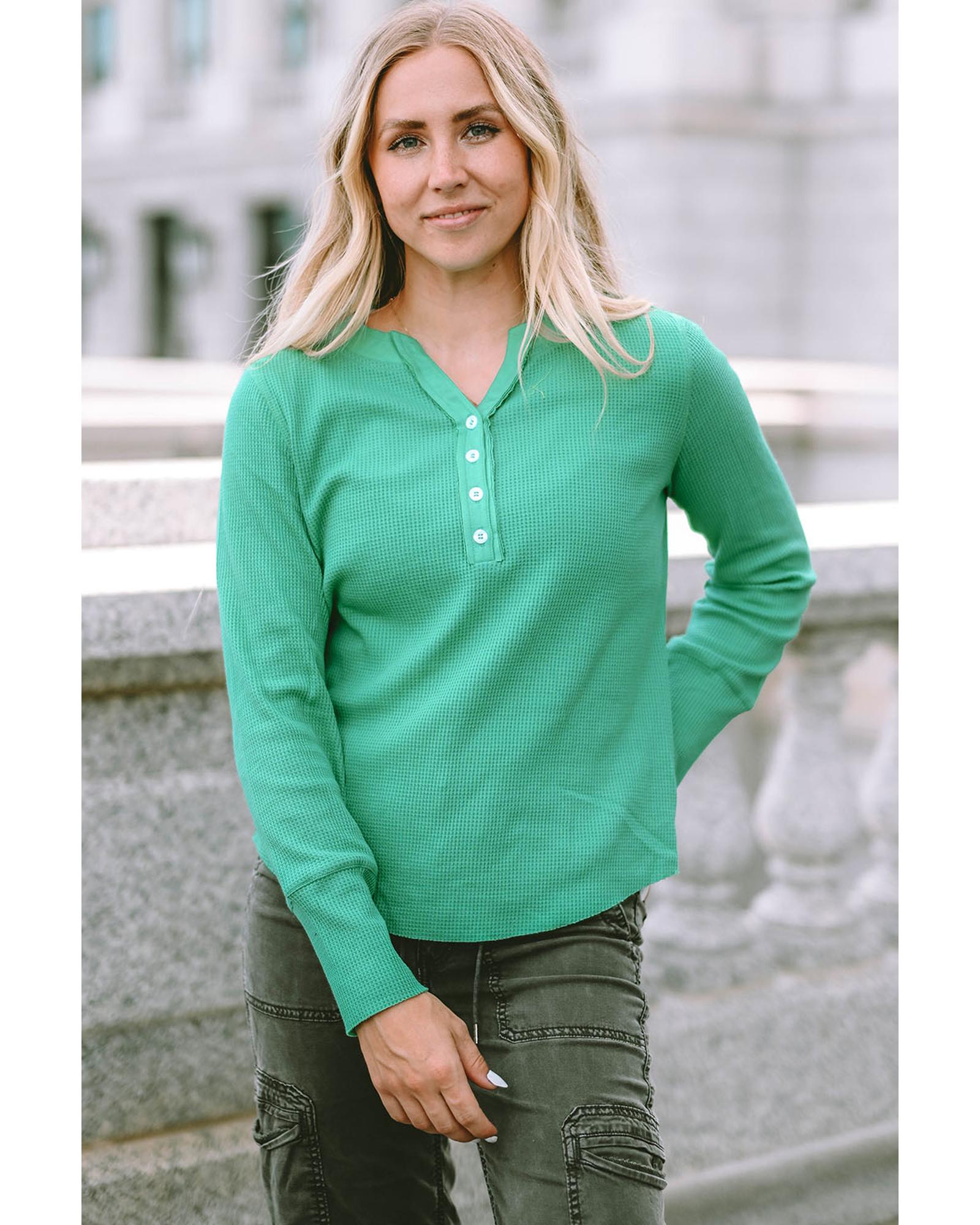 • Luxurious Trimmed Neckline Waffle Knit Henley Top