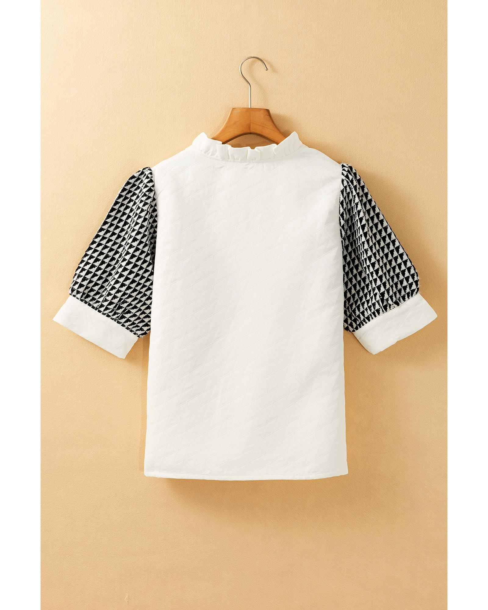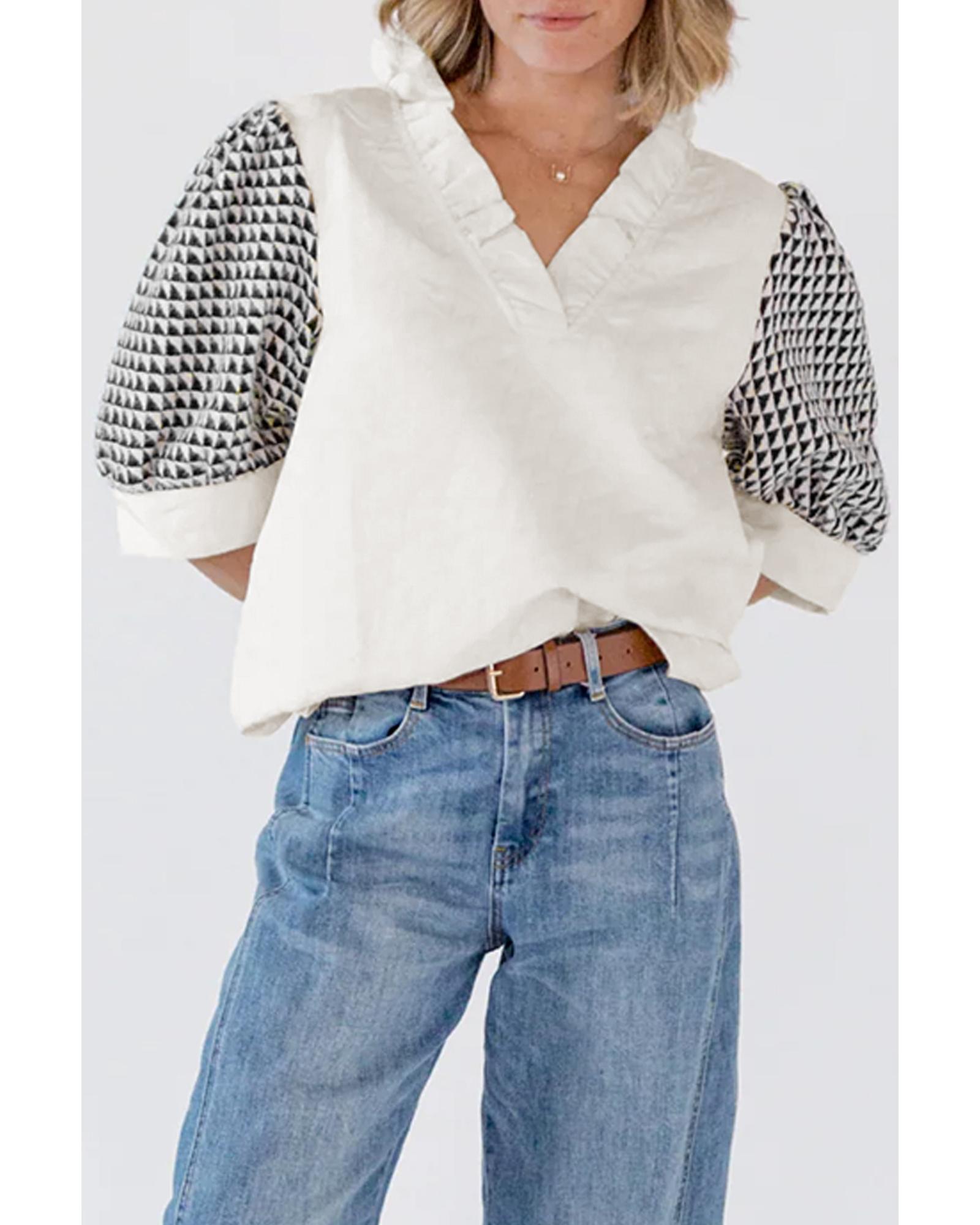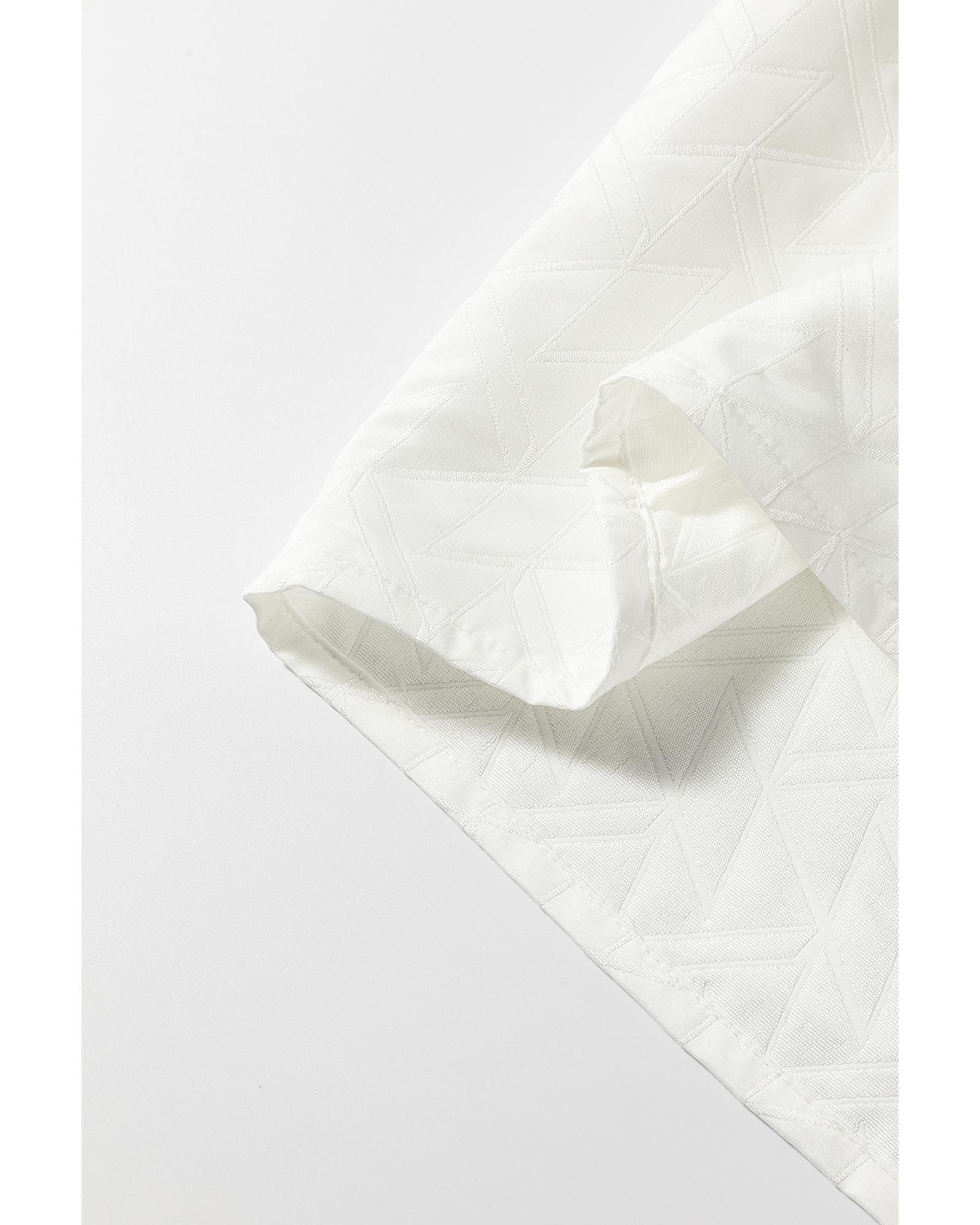 - White geometric textured short sleeve blouse