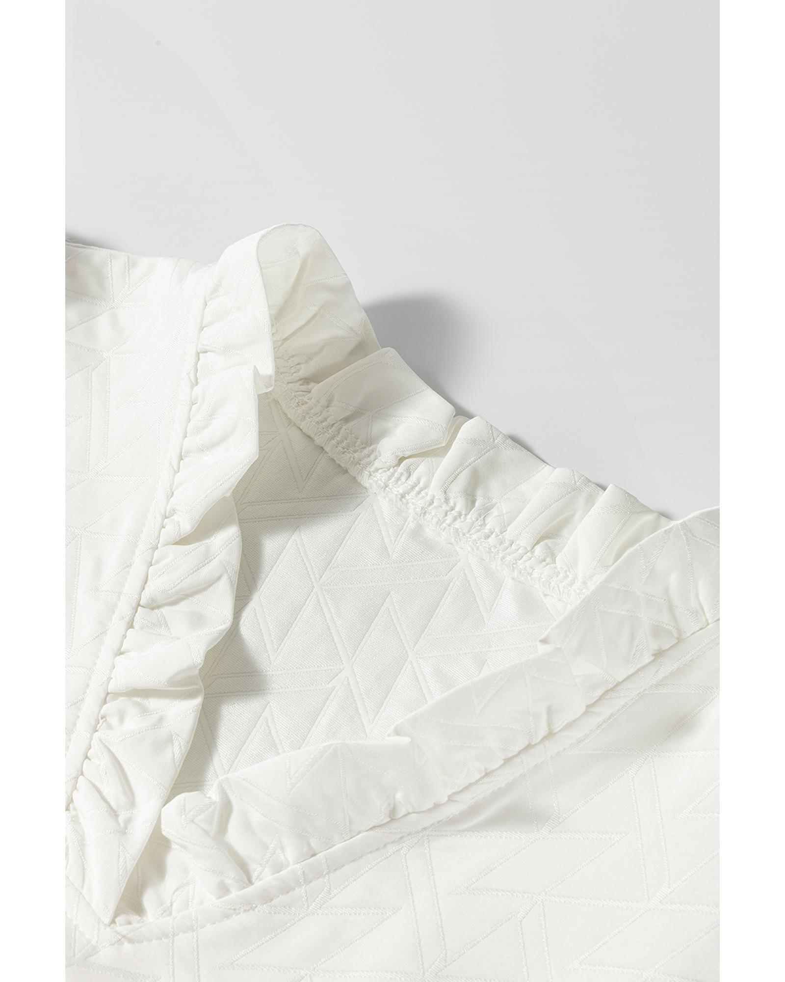 Azura Exchange White Geometric Textured Short Sleeve Frilly V Neck Blouse – L