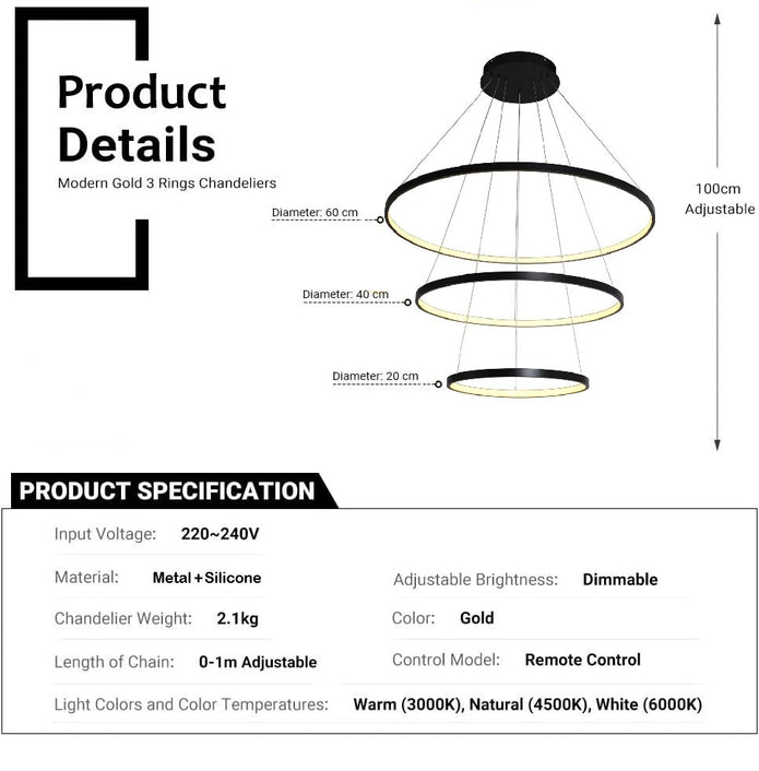 - Moderate Size: The size of high pendant lamp is moderate, and it will not occupy too much space. Round size: 60cm+40cm+20cm, base diameter 20cm, embedded 18cm, height 4cm, Gold pendant lamp, cable length adjustable 100cm meters.