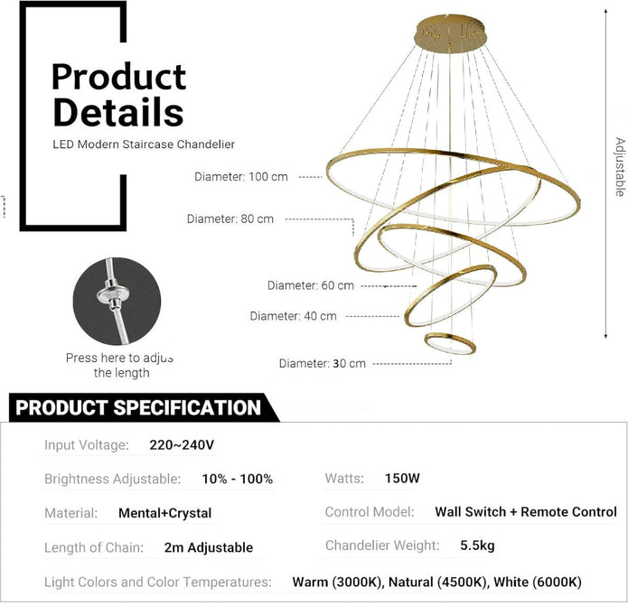 - Moderate Size: The size of high pendant lamp is moderate, and it will not occupy too much space. Round size: 100+80+60+40+30cm, base diameter 30cm, embedded 28cm, height 4cm, Gold pendant lamp, cable length adjustable 200cm meters.