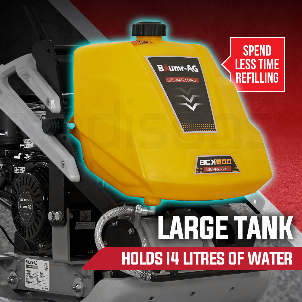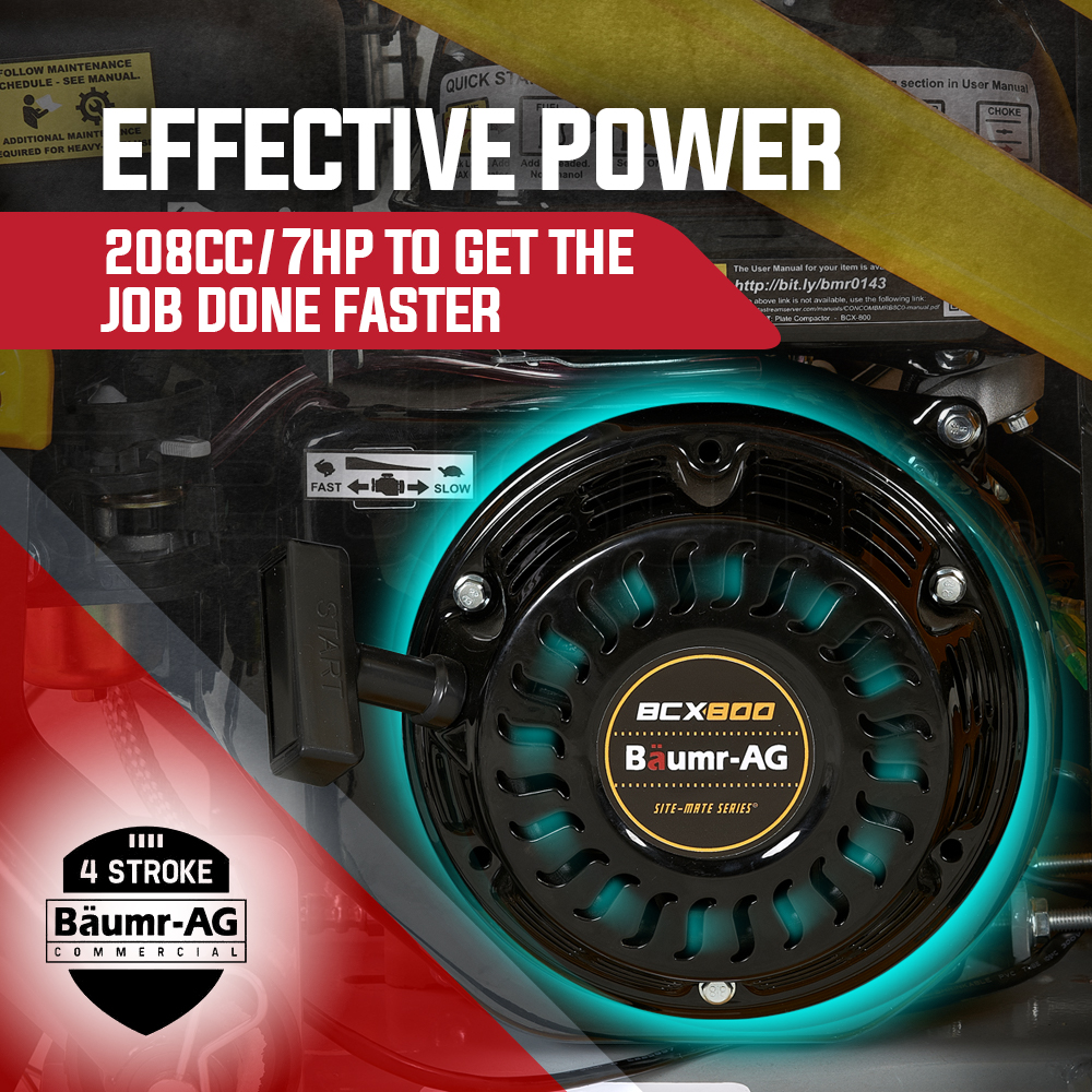 Take one look at the Baumr-AG BCX800 Site-Mate Series Plate Compactor and it’s plain to see that this is a truly next generation design. With high-tech manufacturing employed from the ground up the BCX800 is of course precision robot welded to provide maximum strength and inhibit rust. Encased in the protective frame is a class-leading easy-start air-cooled 7HP 4-Stroke engine that is tough, reliable and efficient.