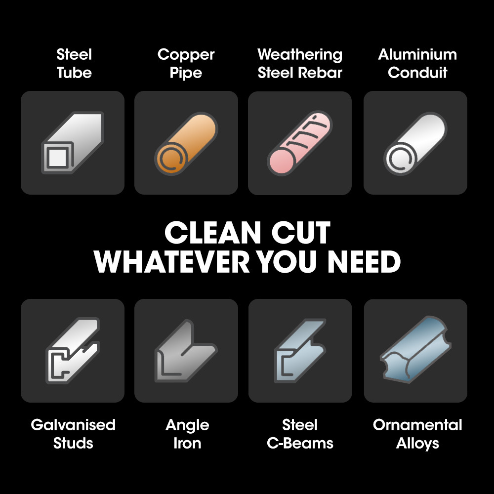 - Easily cut wrought iron, rebar, beams, aluminium, copper, brass and bronze, and any shape of pipe.