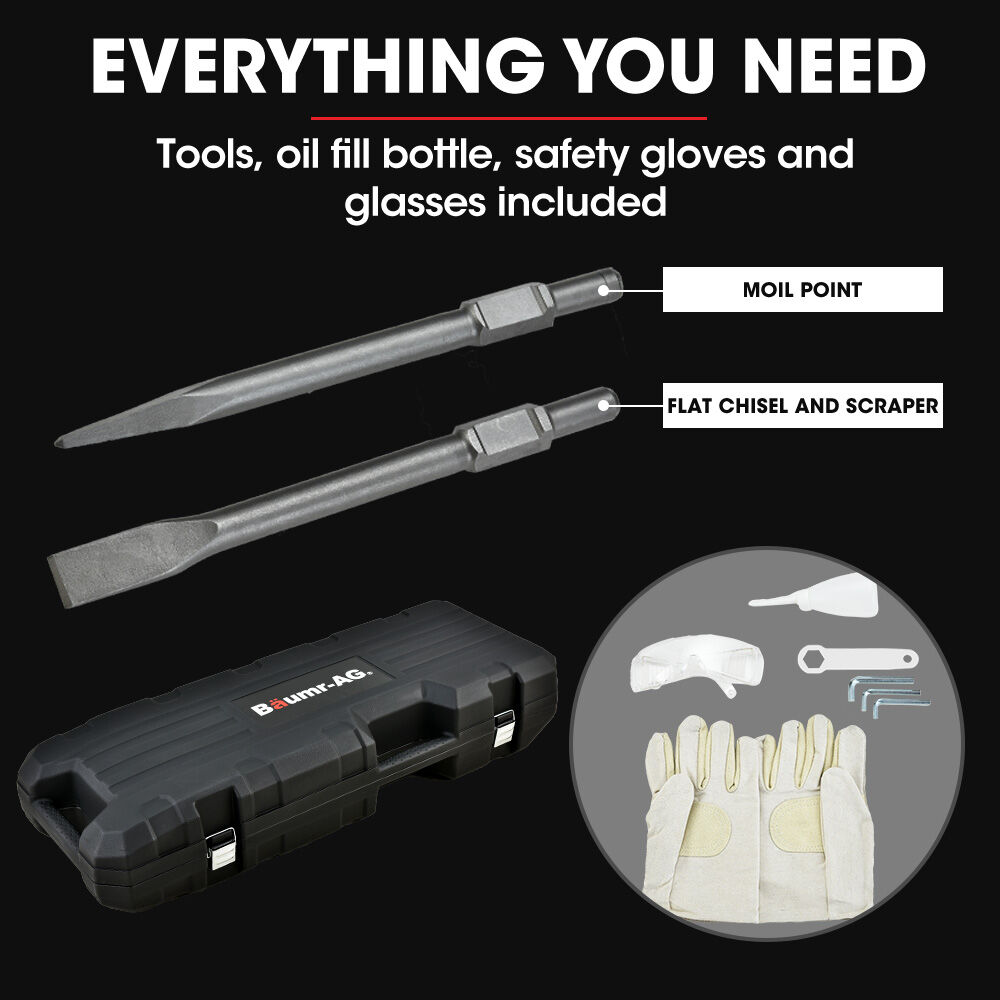 PLUS! This outstanding package includes 3 chisels for chipping and tiling! And an impact-resistant carry-all case, work gloves and safety glasses!