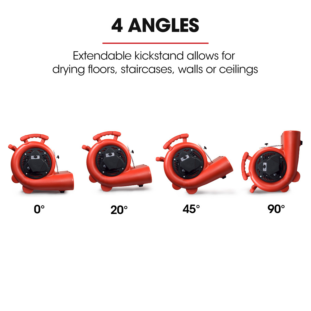 The low profile outlet design allows you to more easily position it under heavy wet carpet and the handy clamp keeps the carpet in position. This Air Mover also features an extendable kickstand which allows for adjusting the angle for the most effective drying of floors, staircases, walls and ceilings.