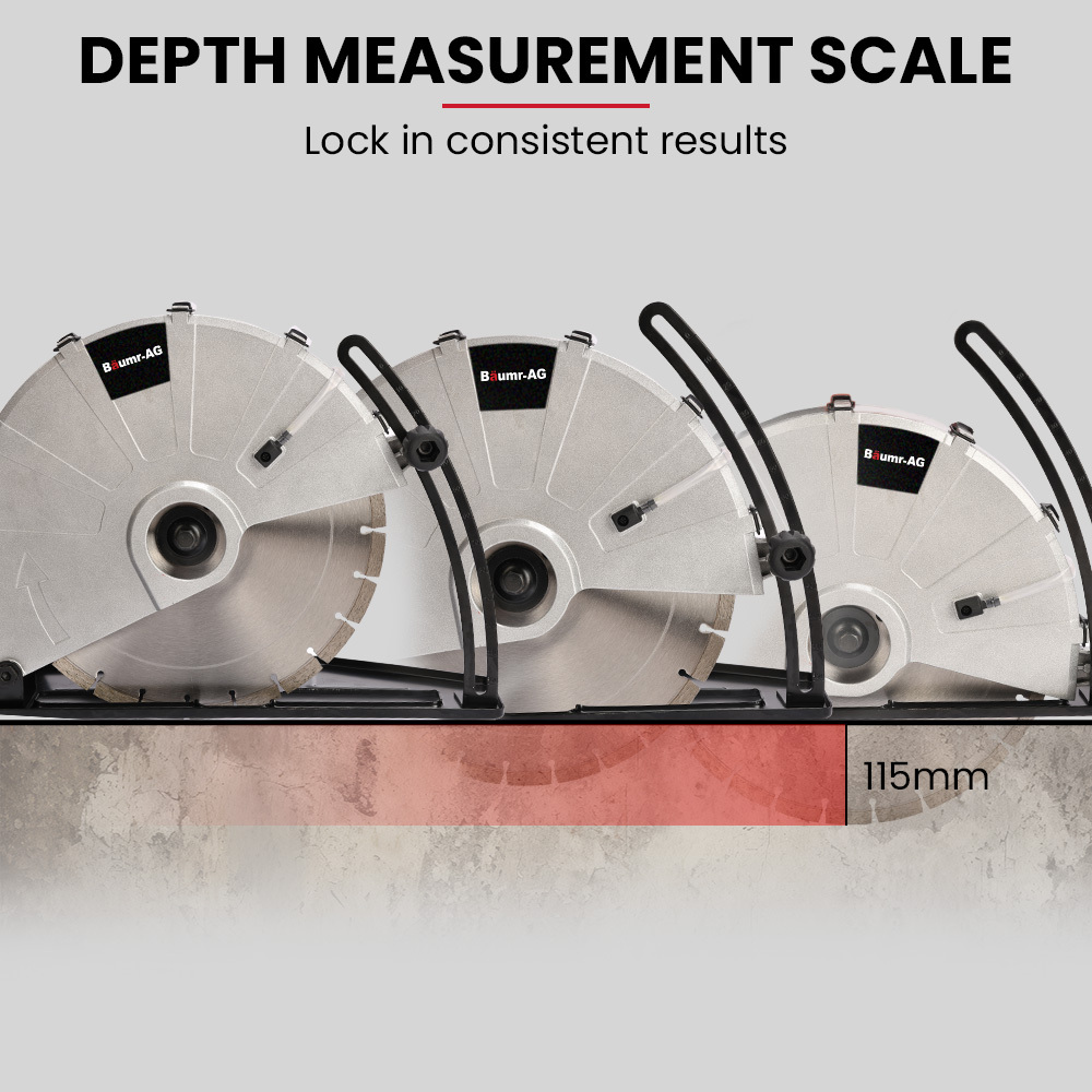 Safety is a top priority with the Baumr-AG CSE-85 Demolition Saw. It includes a trigger lock to prevent accidental startups and RCD power interruption protection for added safety. The adjustable blade guard protects the user during operation.