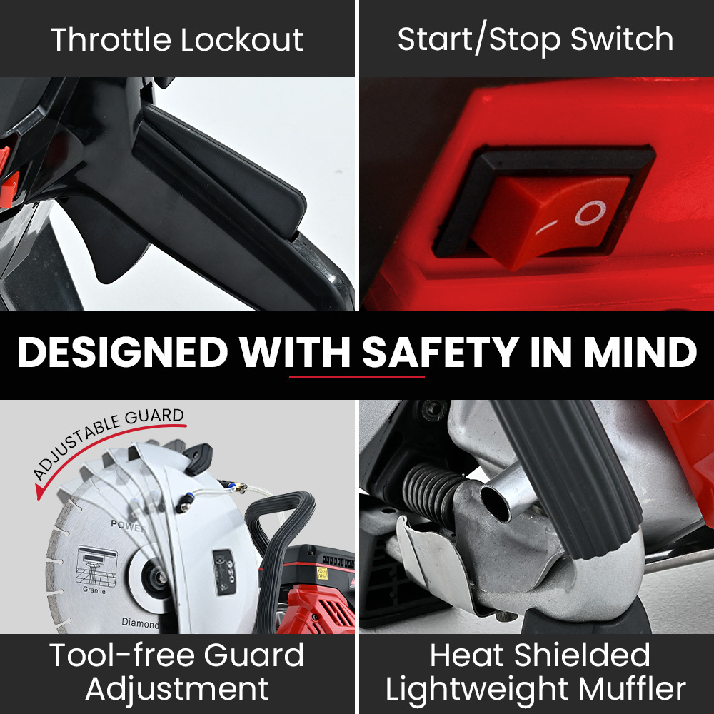 Maintenance is effortless, thanks to the easy-to-adjust belt tensioning system, while the dual arbor compatibility (20mm and 1 inch) ensures flexibility for a variety of blades. The 900ml fuel tank and efficient 25:1 fuel-oil mix provide long-lasting, reliable performance. Whether on a construction site or handling landscaping tasks, the CSP-800 Pro delivers results you can trust.