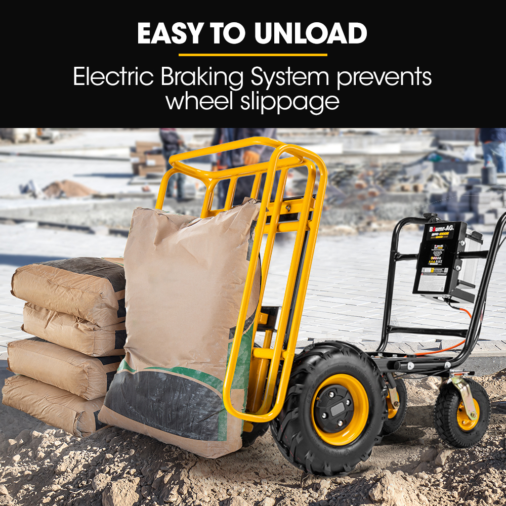 Introducing the Baumr-AG 4 Wheeled BPR-1000E: The 40V Battery Powered 2WD Utility Cart is designed to revolutionise your heavy-duty material hauling. It has versatile features offering convenience and efficient zero-emissions operation. This wheelbarrow is a game-changer for job sites, warehouses, farms and landscaping tasks.