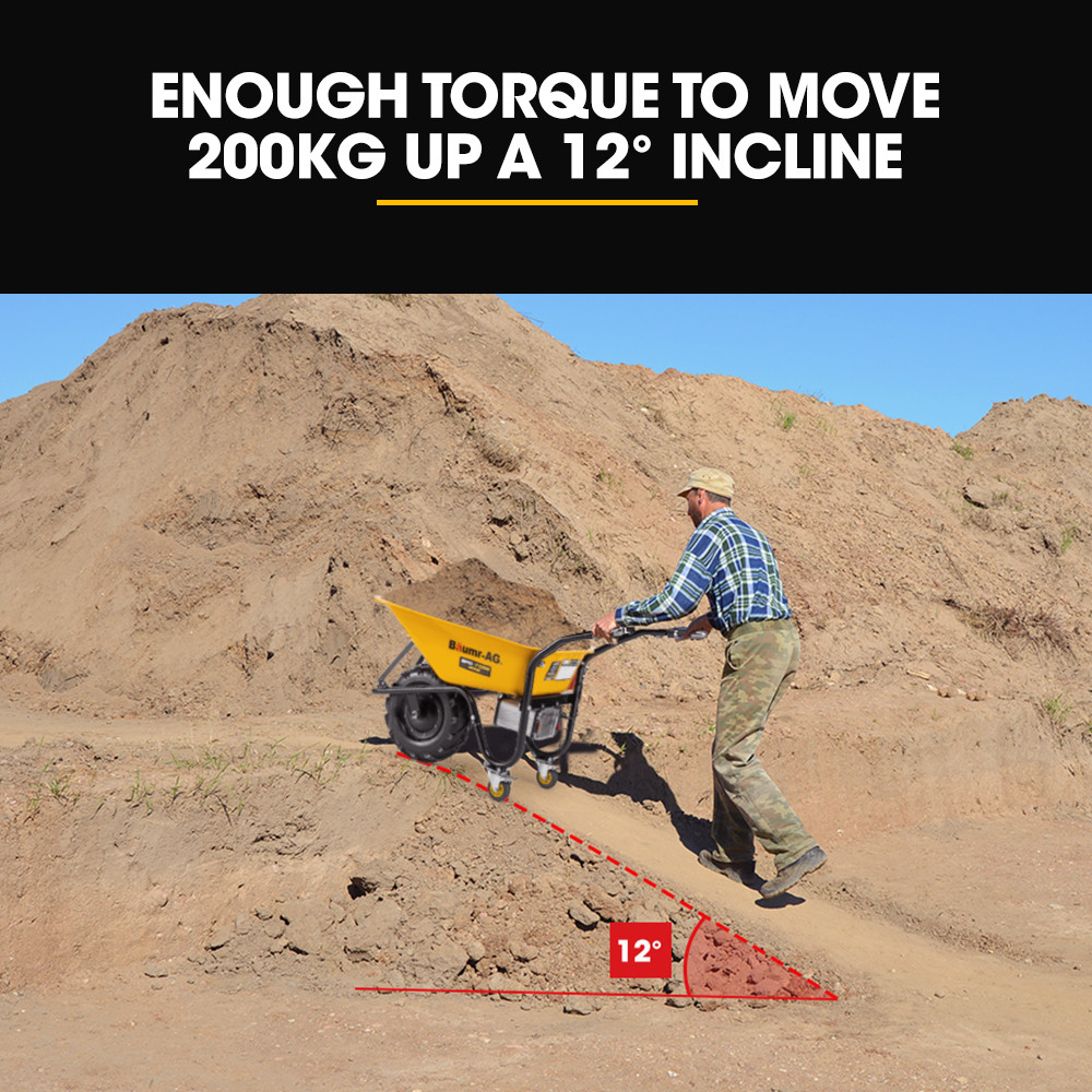 Experience the high productivity and low fatigue of the BPR-700E, making your tasks more efficient than ever before. Carrying heavy loads is a breeze with its impressive max load capacity of 260kg on flat ground and can carry 200kg up a 12° incline. Conquer any obstacle with confidence, whether you’re on challenging terrain or traversing longer distances, this wheelbarrow makes it easy to handle all your material needs.