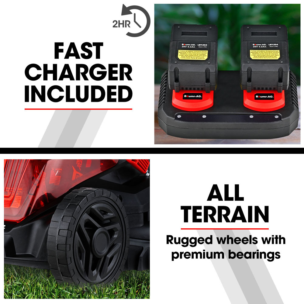 The 500CX houses two long-lasting Baumr-AG SYNC 20V 4Ah batteries that provide 40 volts of cutting-edge technology. For ultimate convenience, the Baumr-AG SYNC batteries are compatible with the wide range of Baumr-AG cordless electric garden and workshop power tools. It also comes complete with a dual battery fast charger which recharges them in only 2 hours.