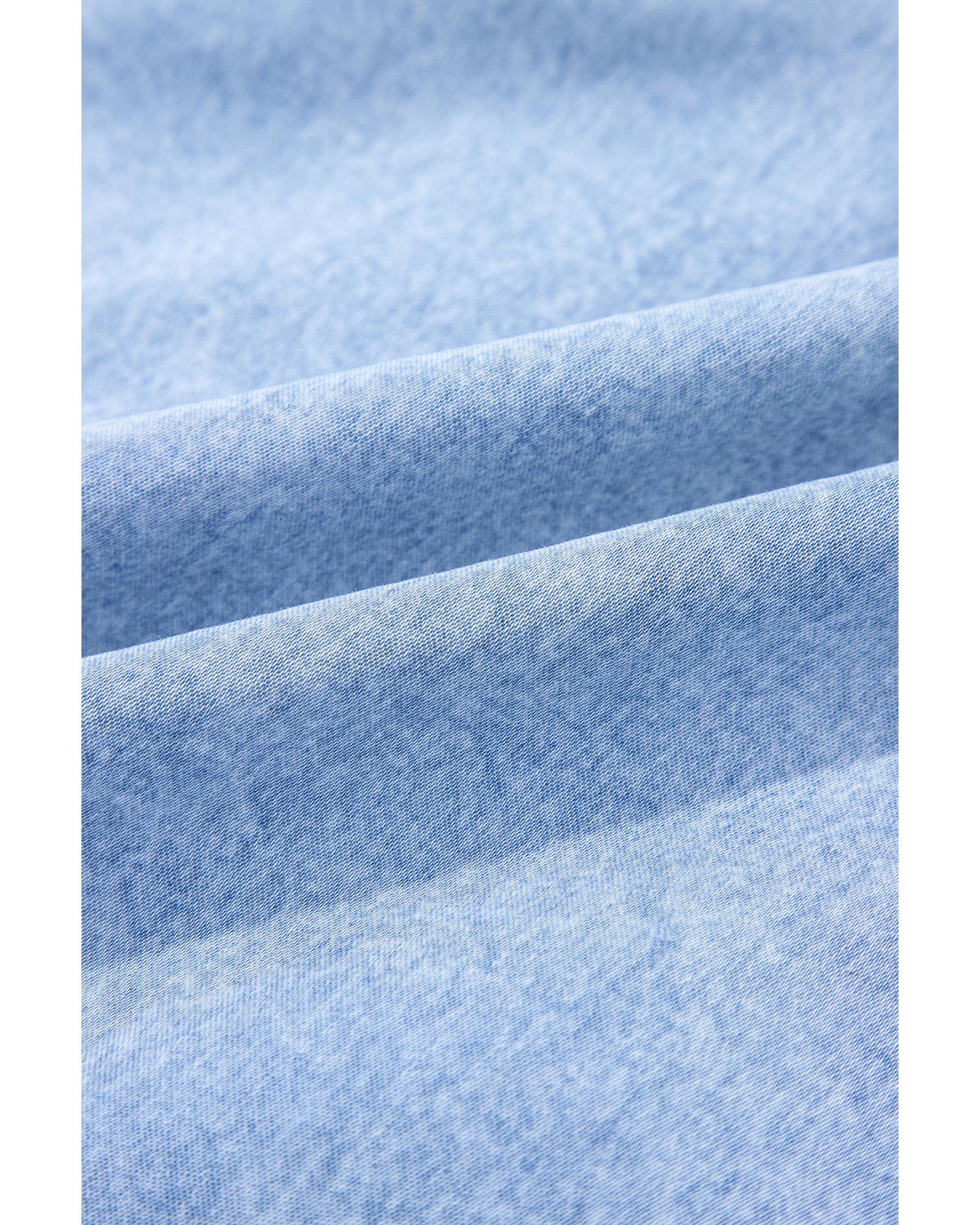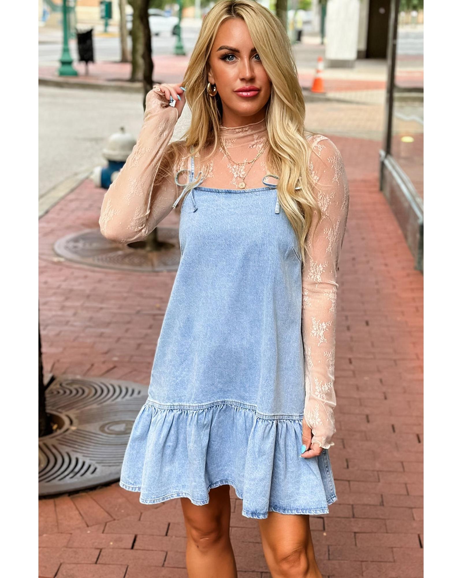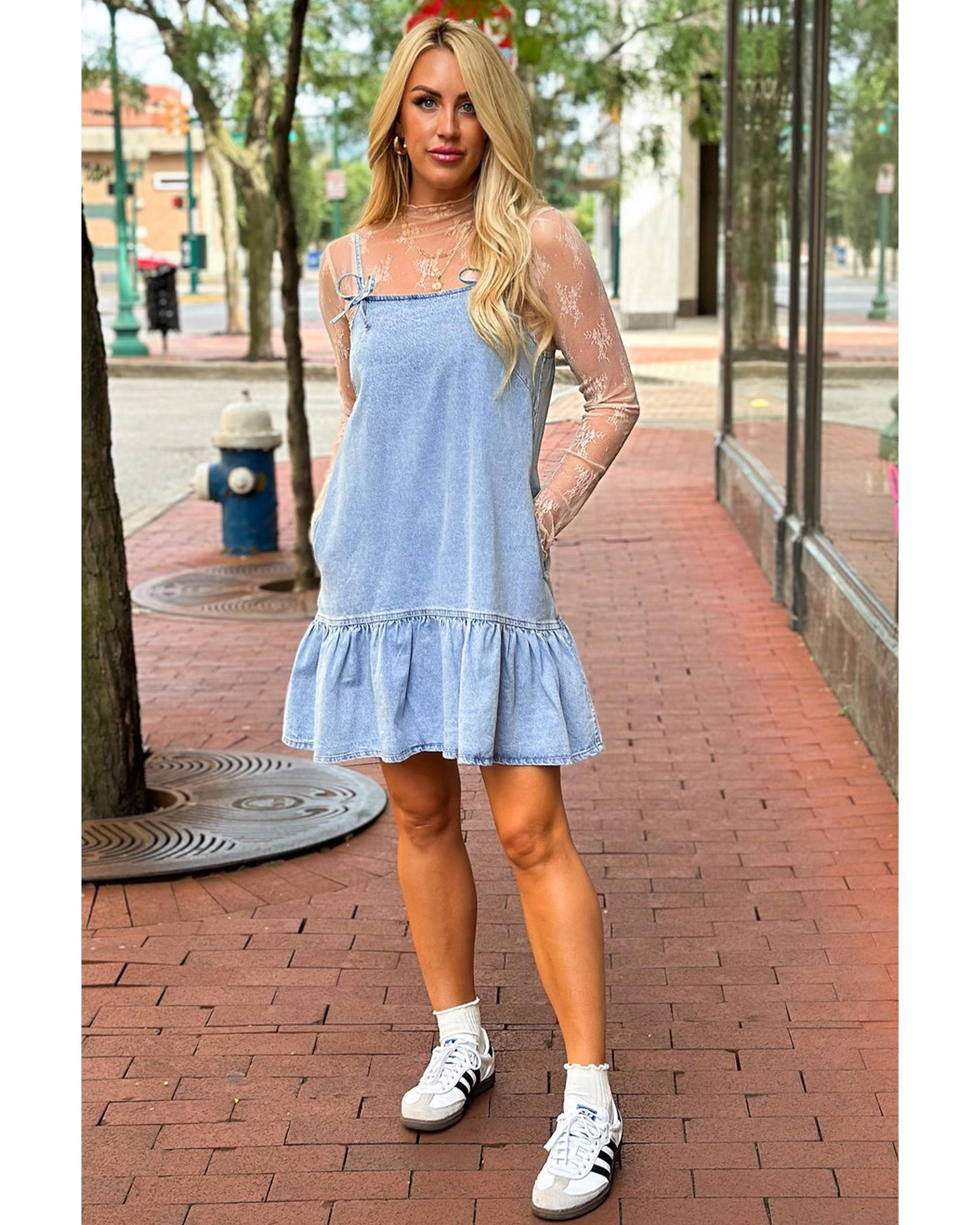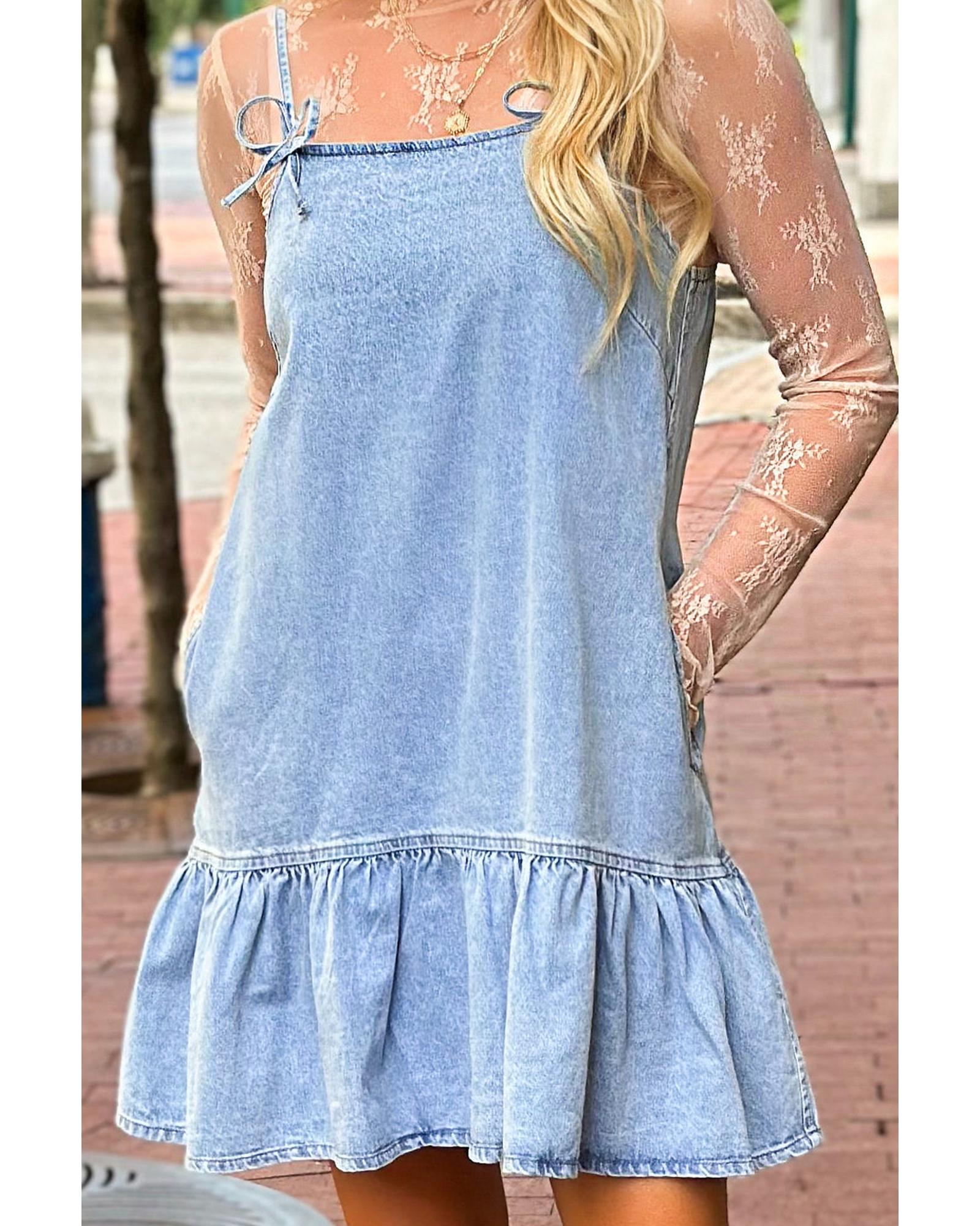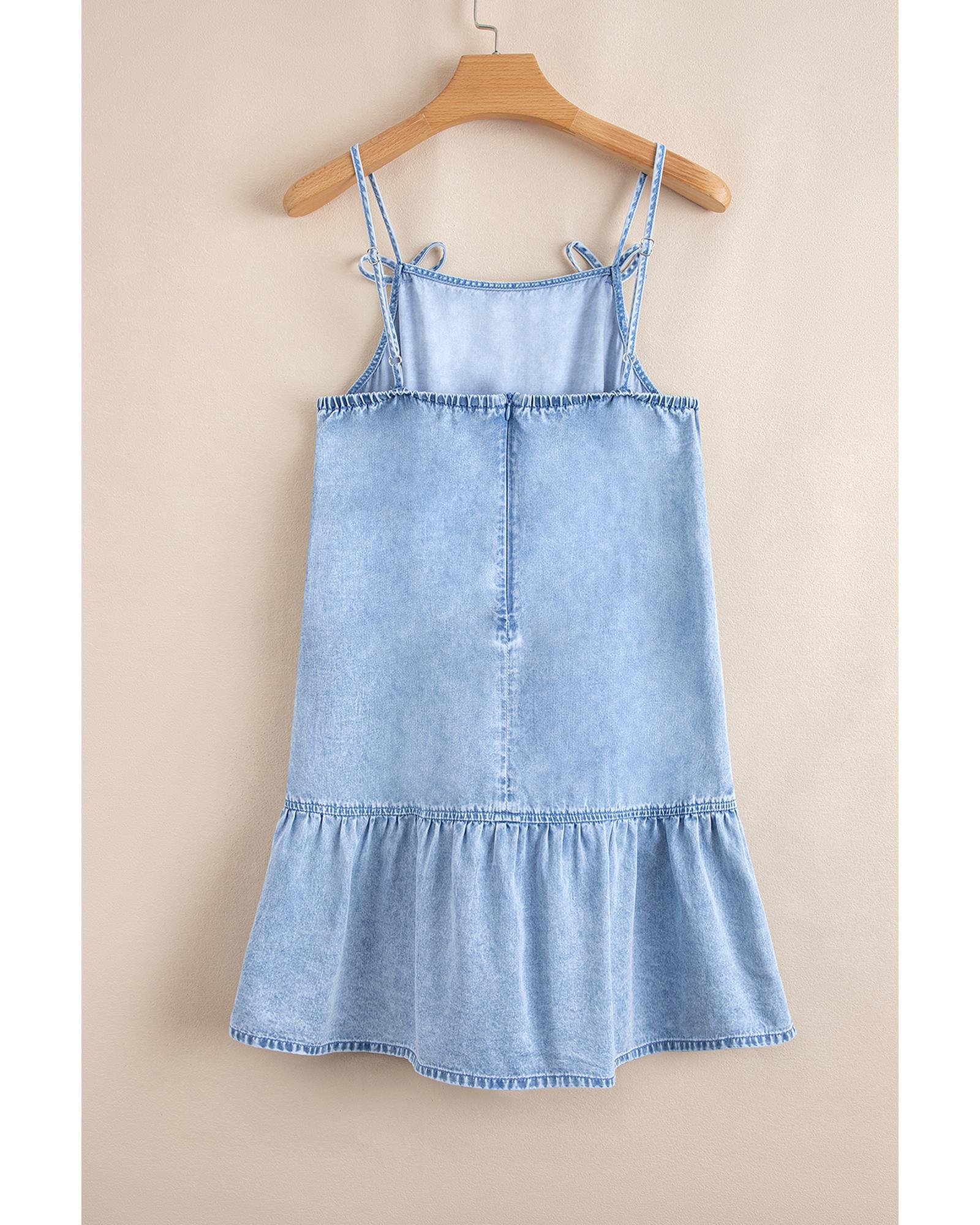 - Beau Blue Bow Detail Spaghetti Straps Ruffle Hem Denim Short Dress