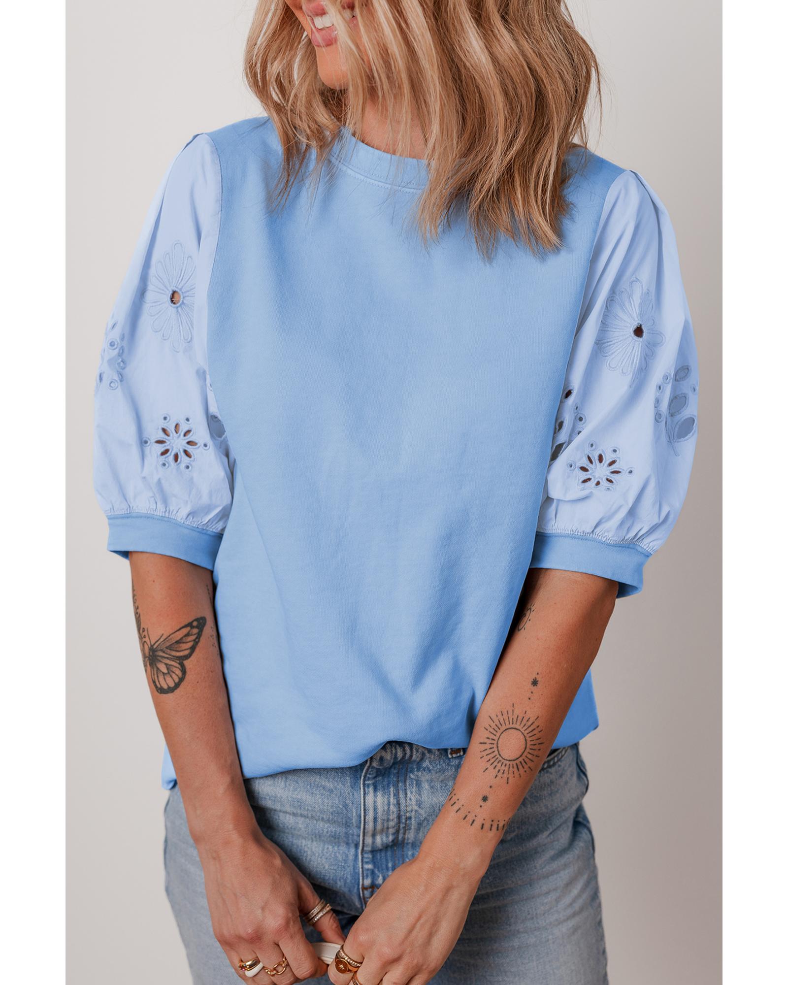 Beau Blue Eyelet Flower Embroidered Puff Short Sleeve Patchwork Crew Neck Blouse – L