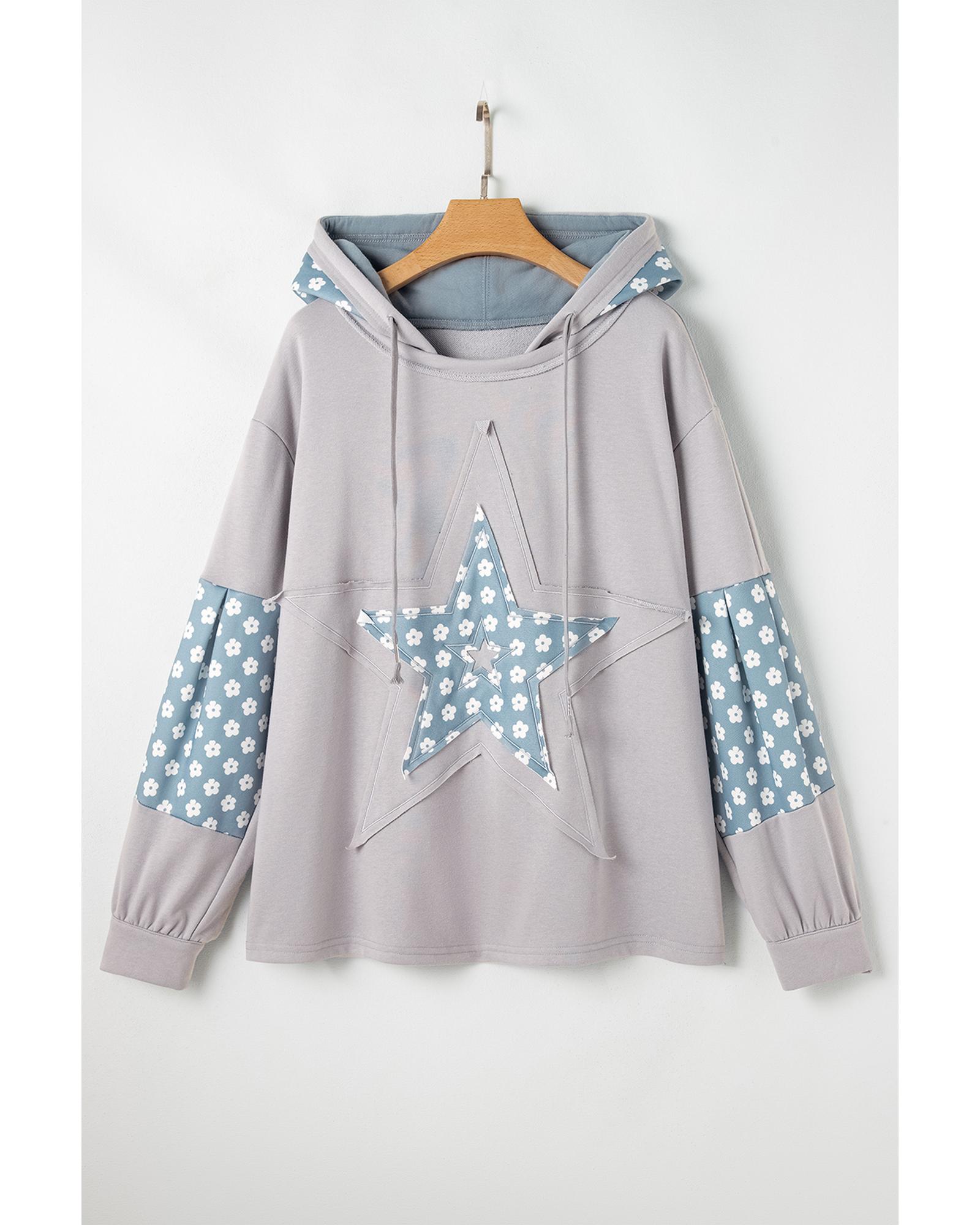 Beau Blue Floral Patchwork Star Pattern Drawstring Hoodie – S