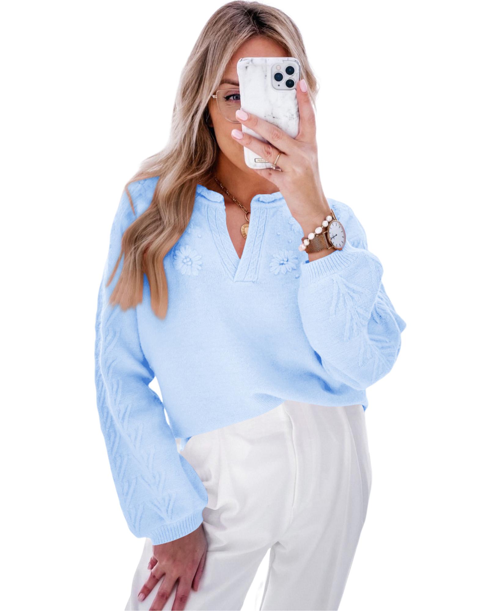 Beau Blue Flower Detail Knitted Notched Neck Sweater – S