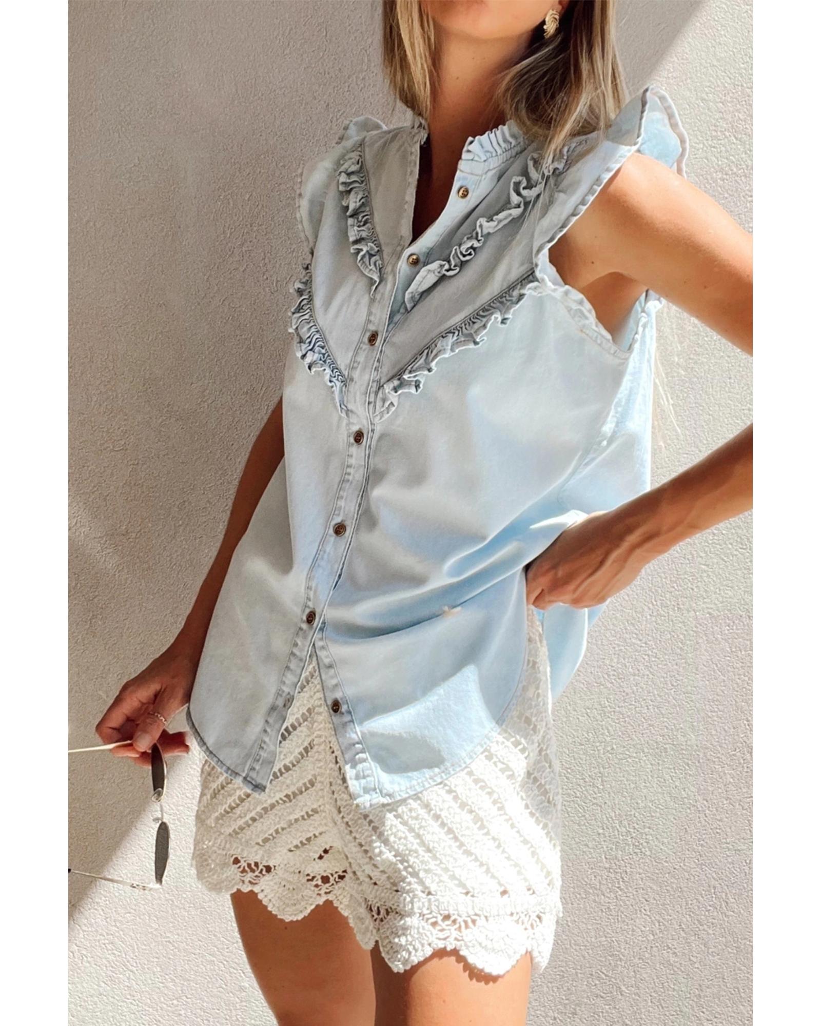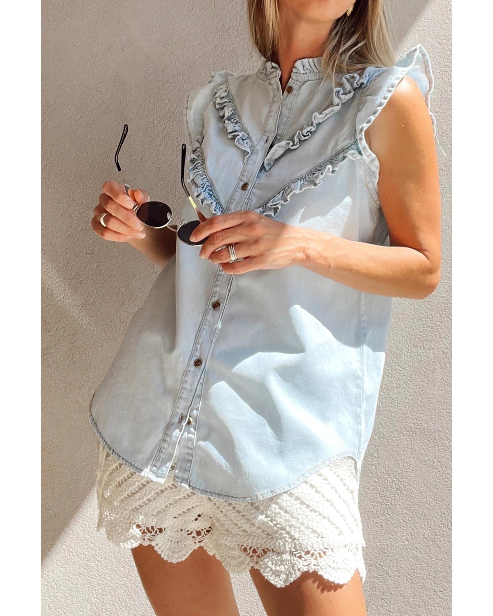 Beau Blue Mineral Wash Cap Sleeve Frilled Button Up Denim Shirt – M