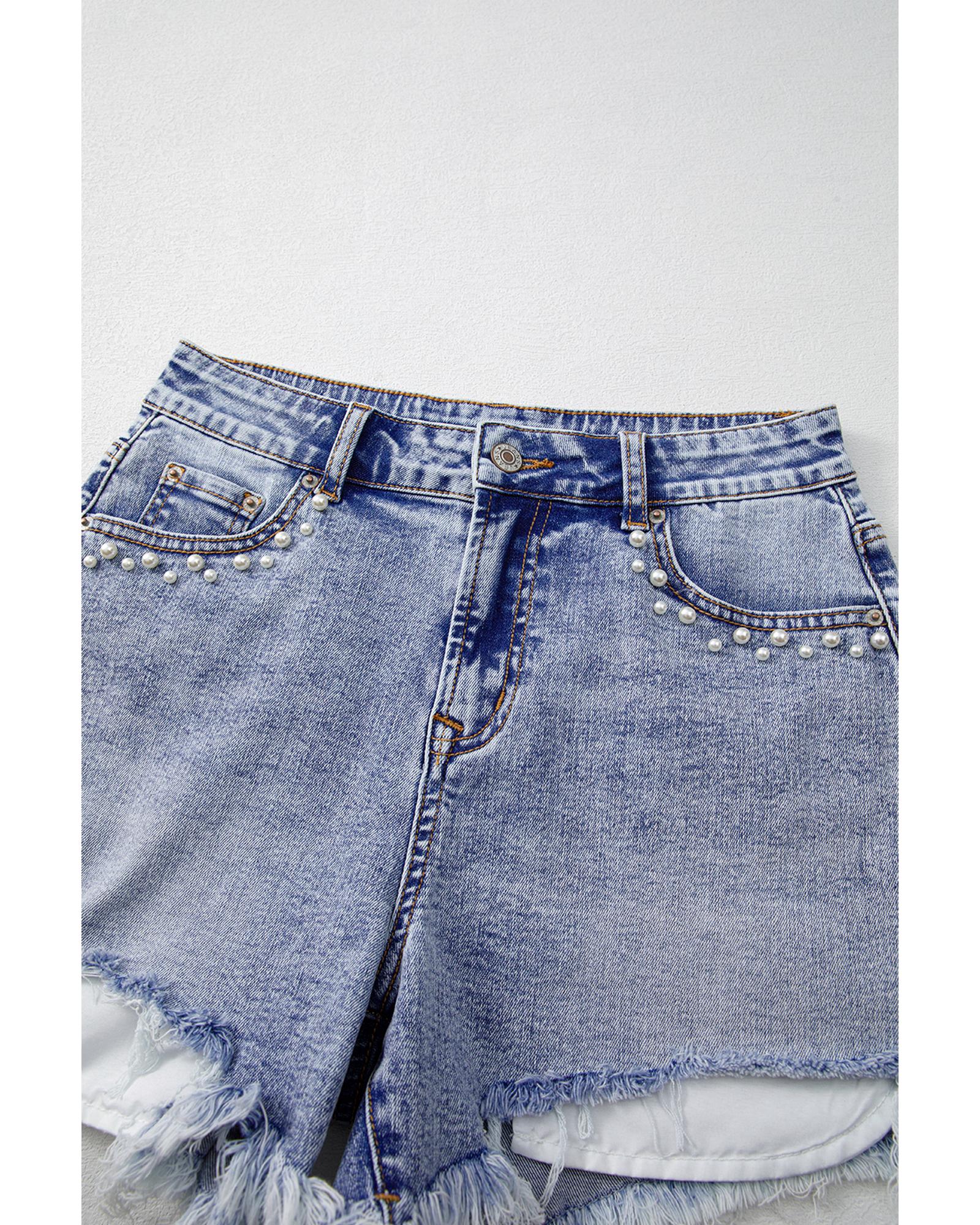 Beau Blue Pearl Studded Pockets Raw Hem Denim Shorts – 14 US