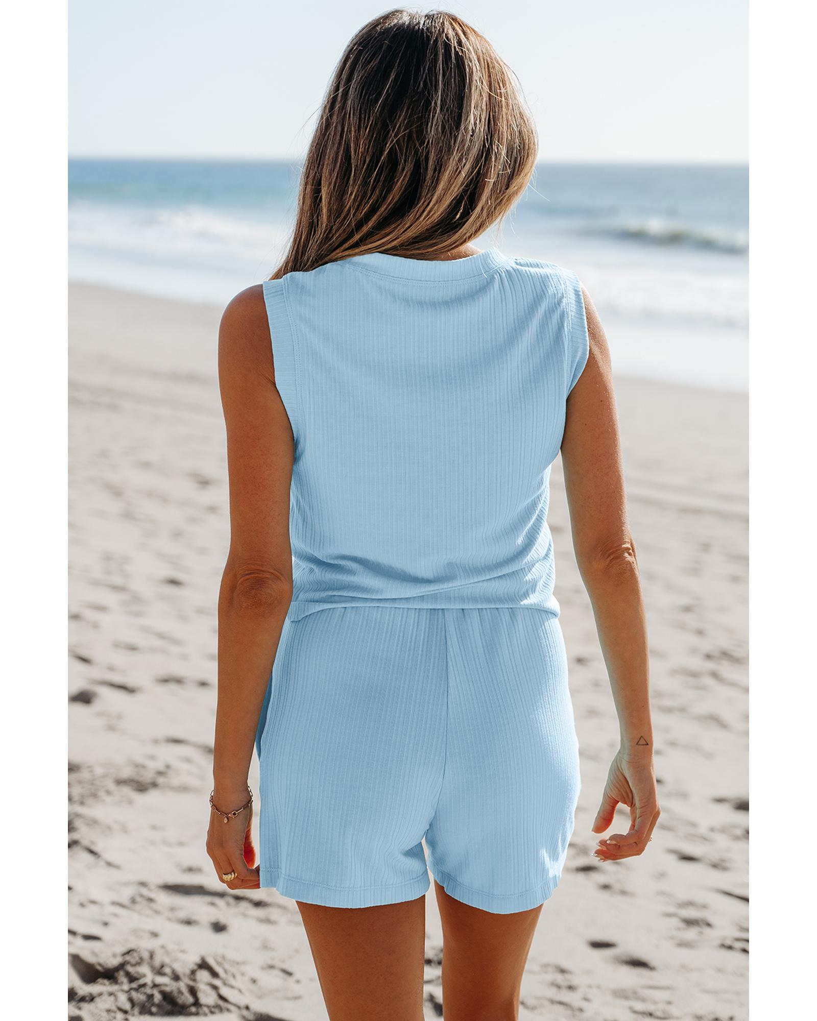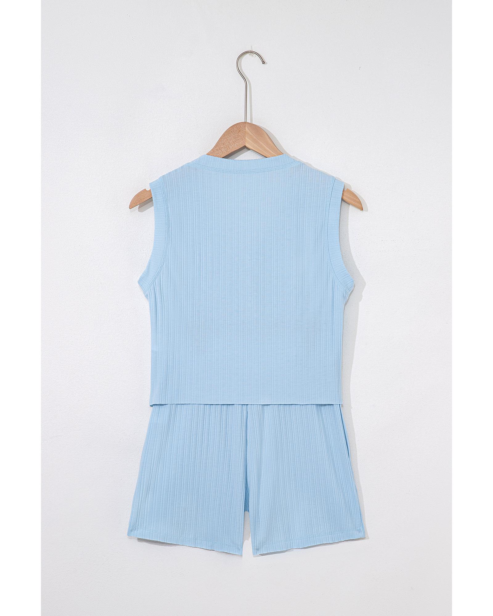 Beau Blue Ribbed Button V Neck Tank Top and Shorts Set – S