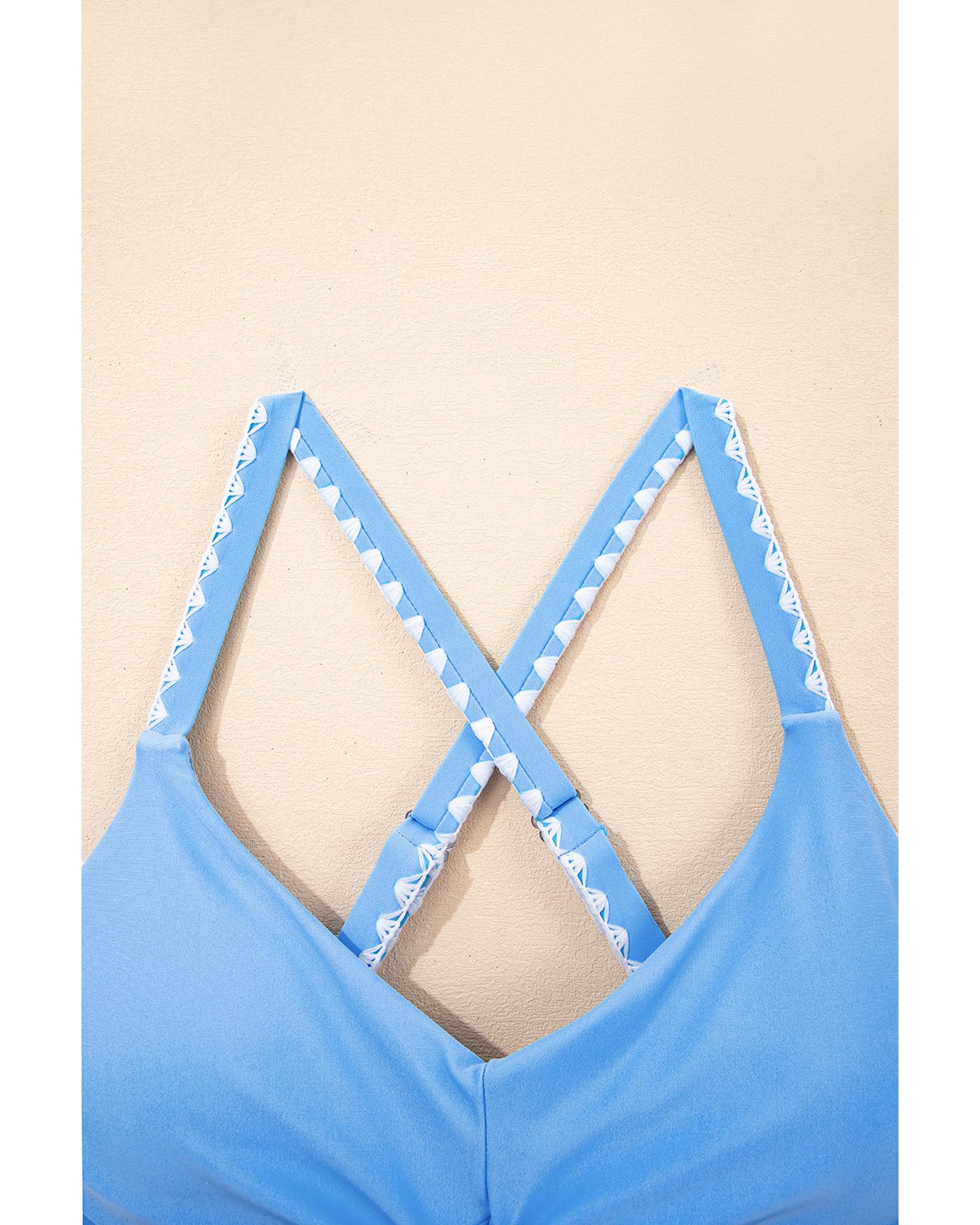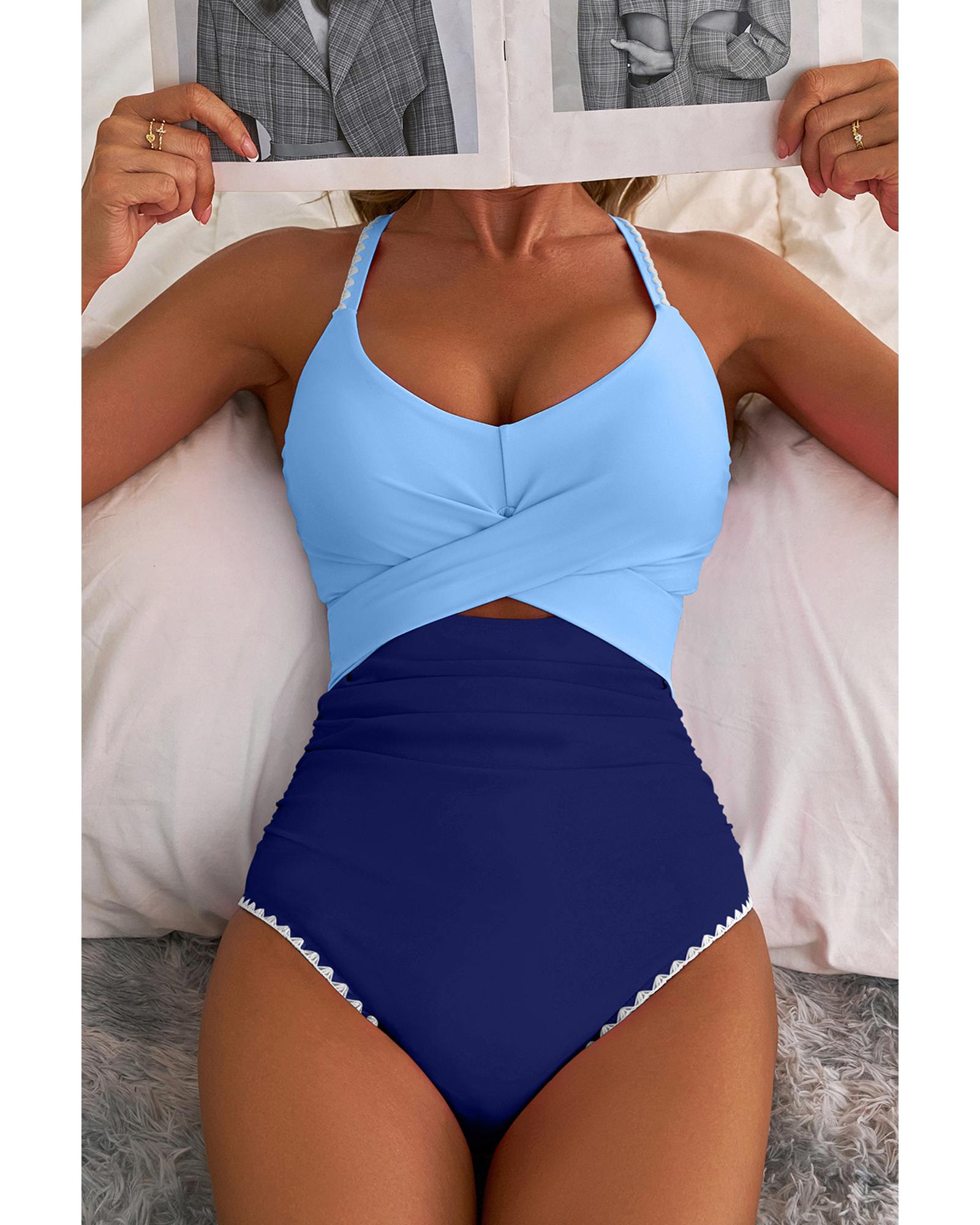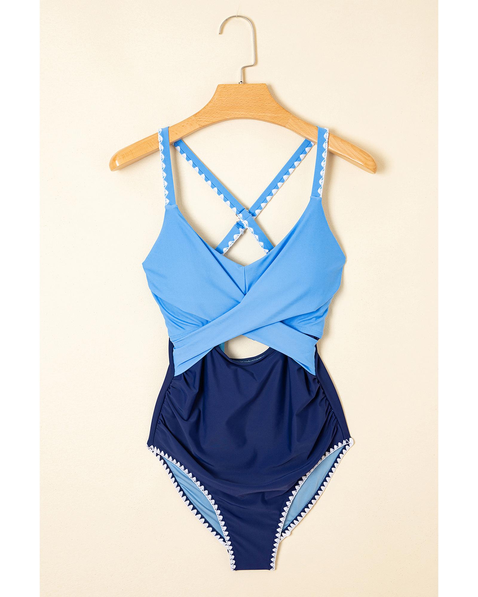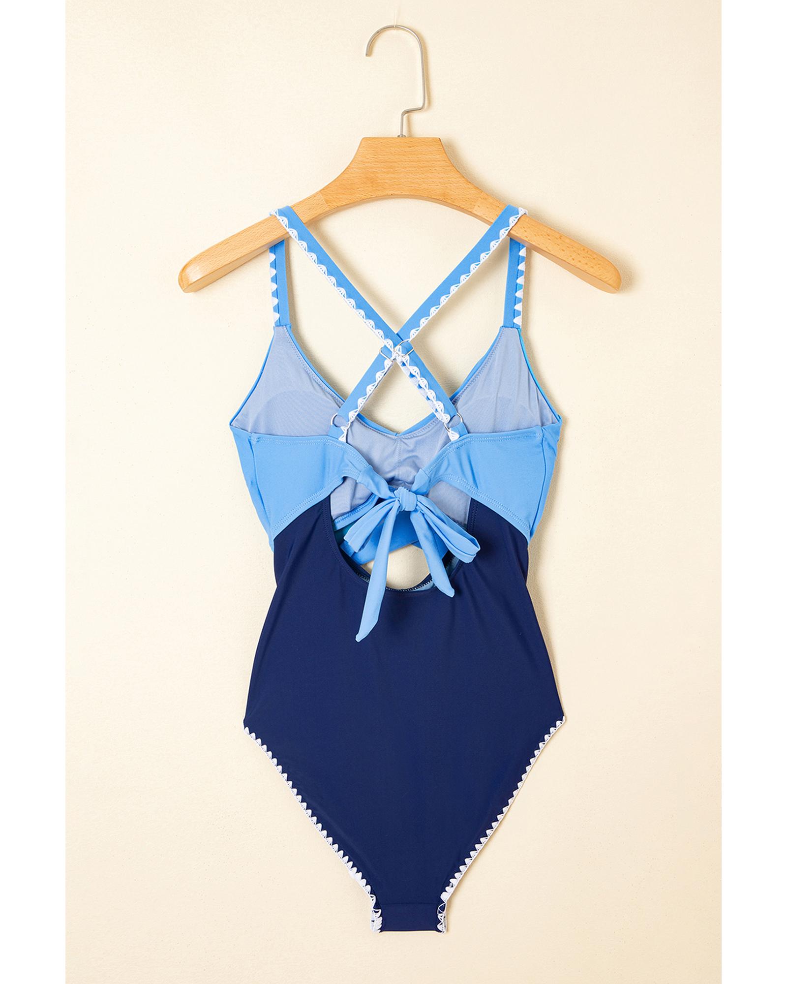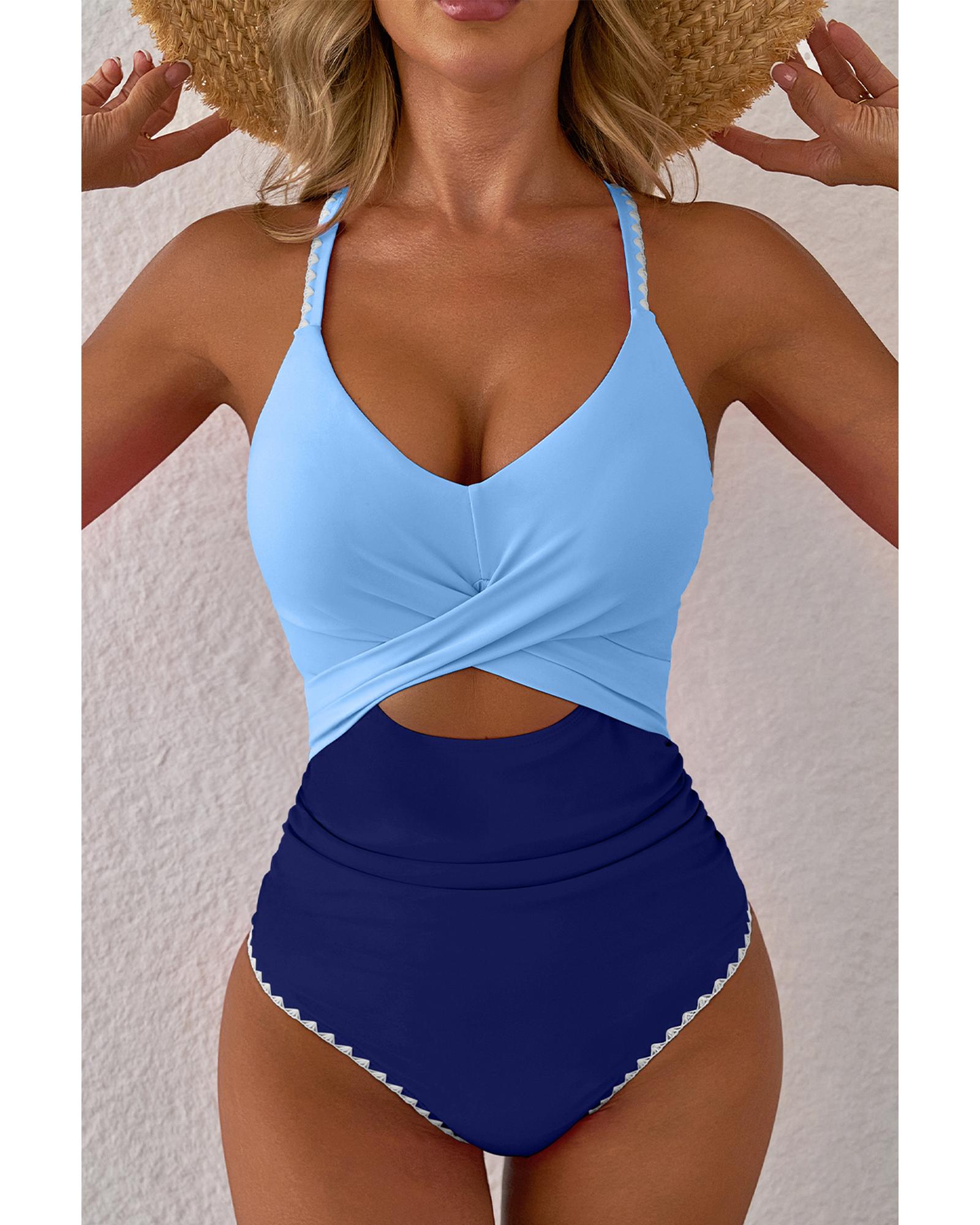 Beau Blue Ric Rac Trim Contrasted Patchwork Cutout One Piece Swimsuit – L