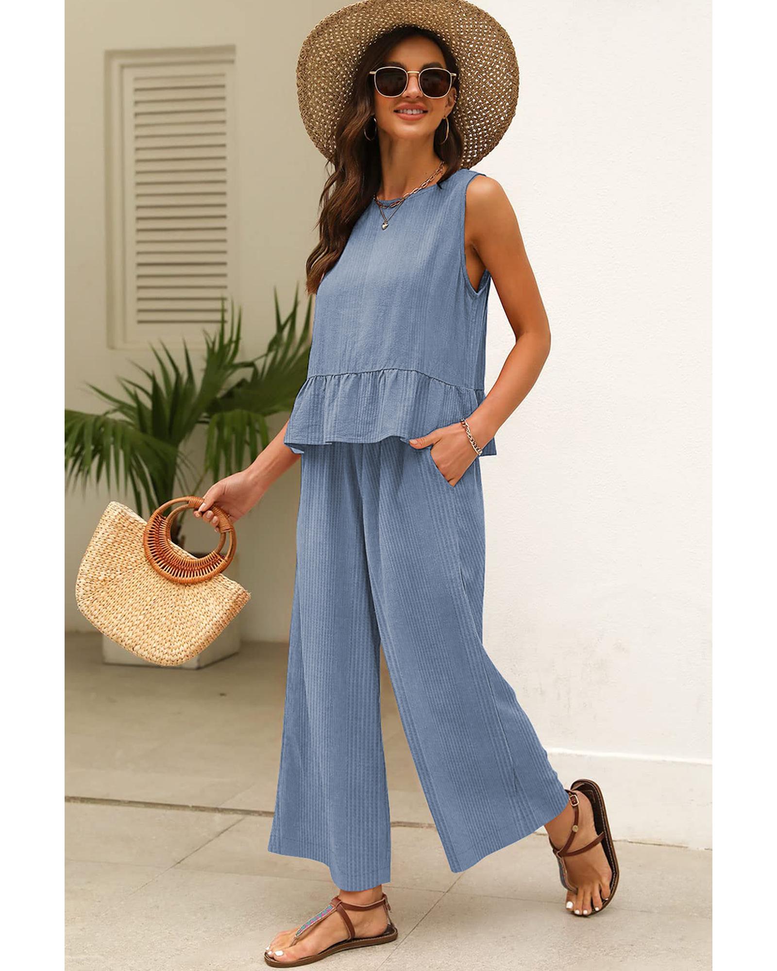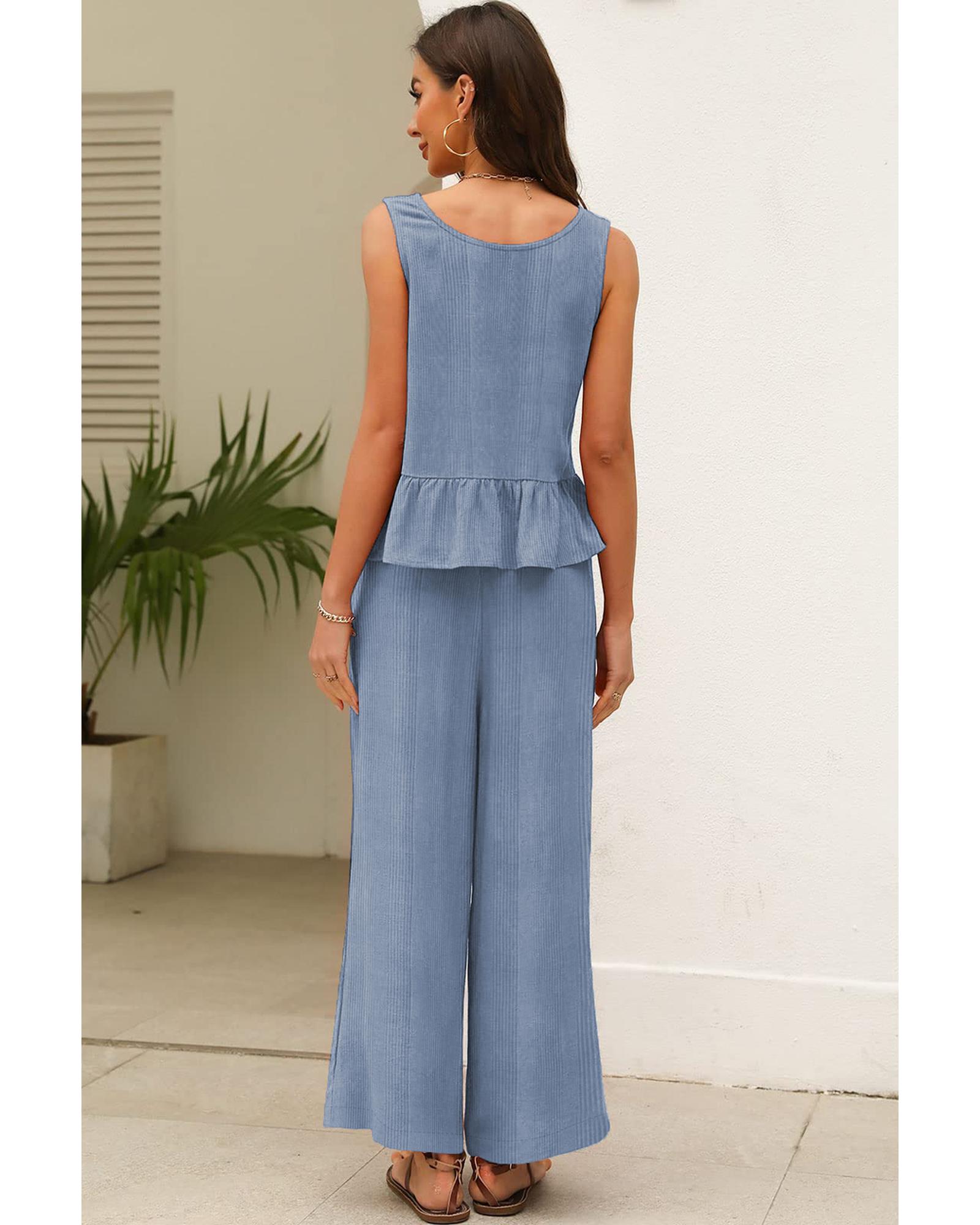 Beau Blue Solid Color Ribbed Ruffle Tank Top and Pants Set – S