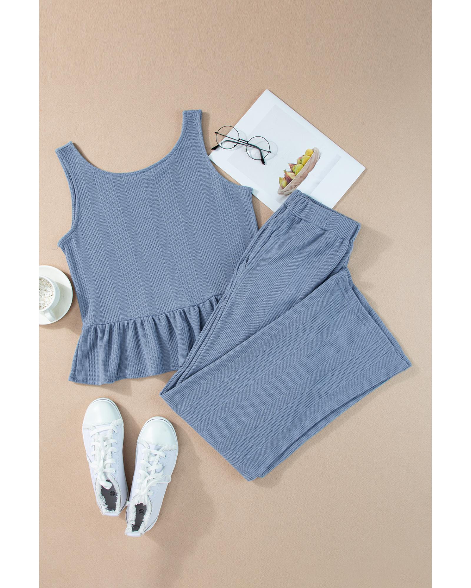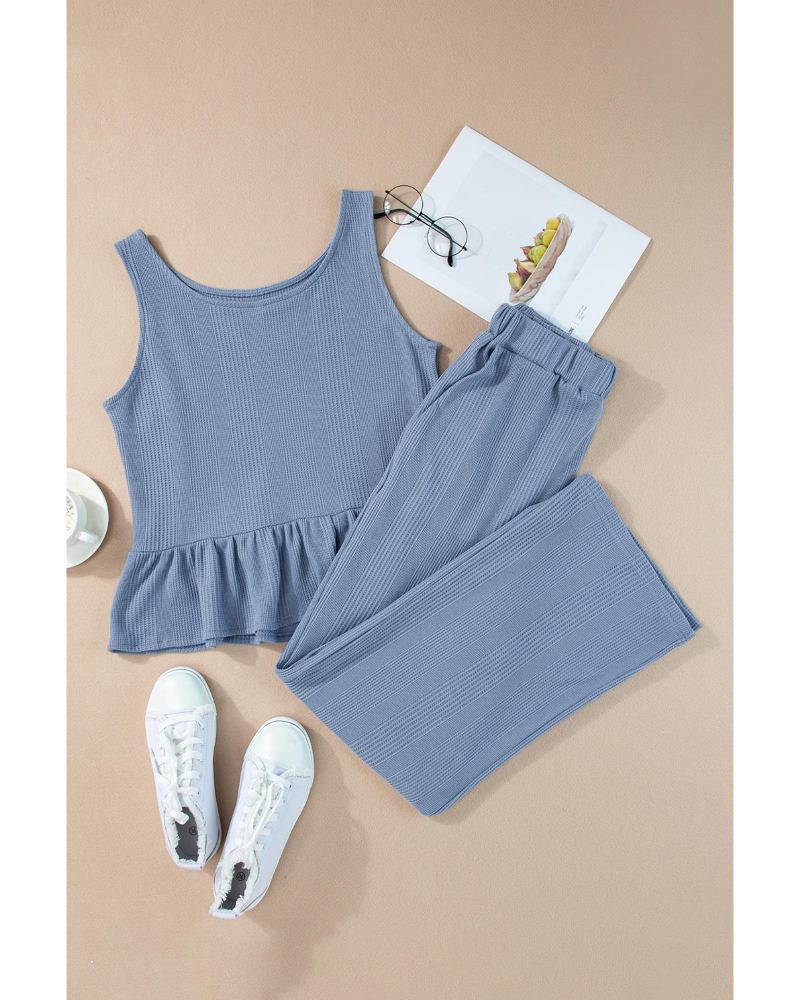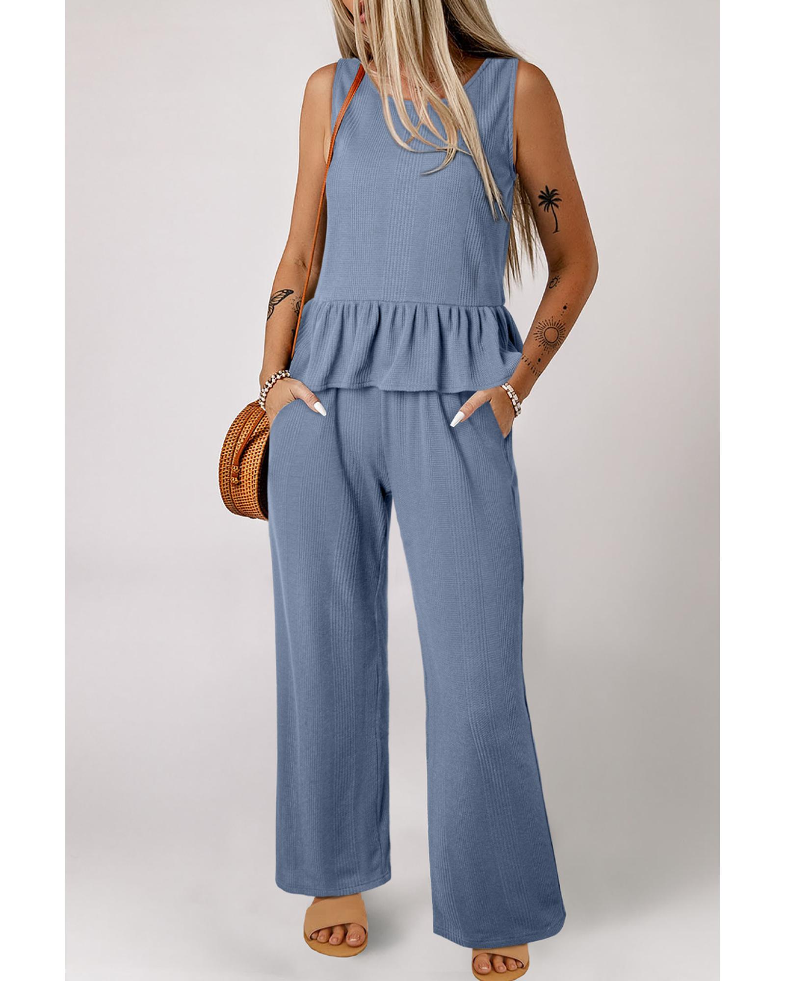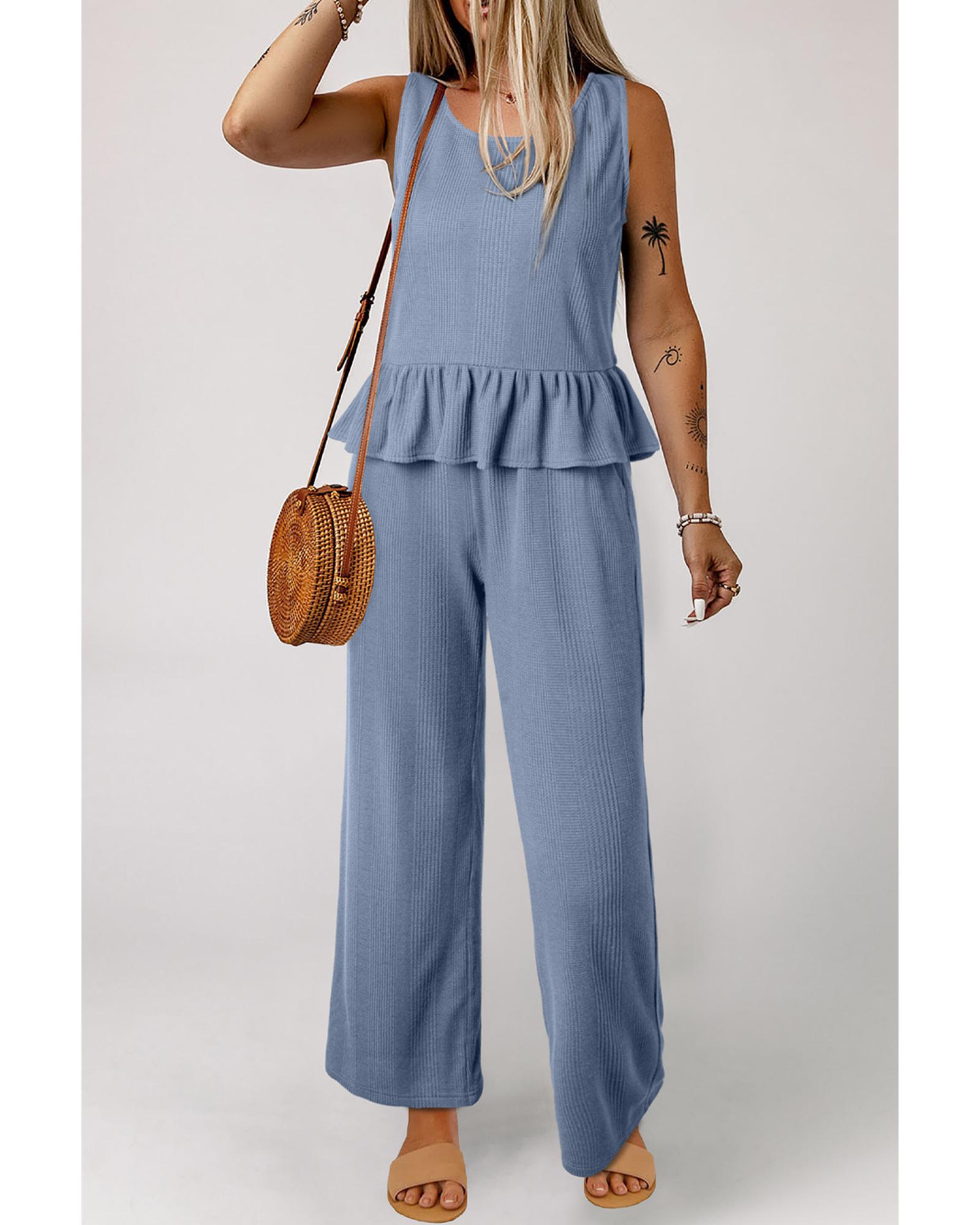 Beau Blue Solid Color Ribbed Ruffle Tank Top and Pants Set – XL