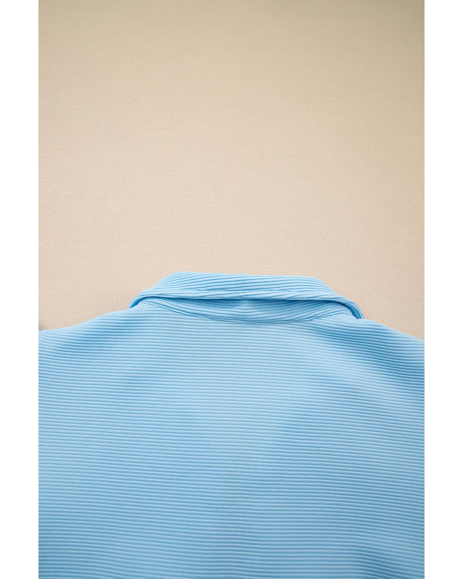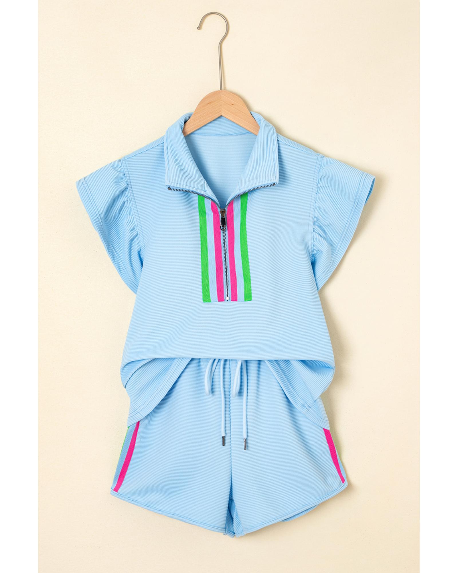 Beau Blue Striped Detail Flutter Sleeve Zipped Collar Short Set – M
