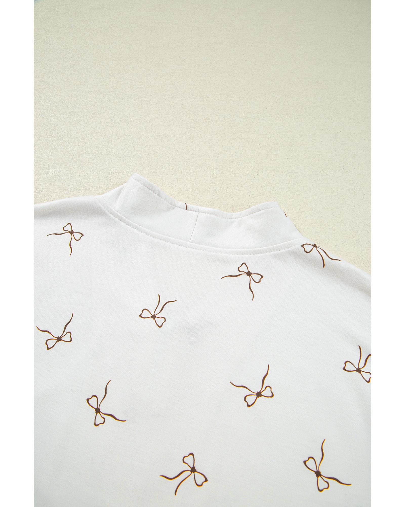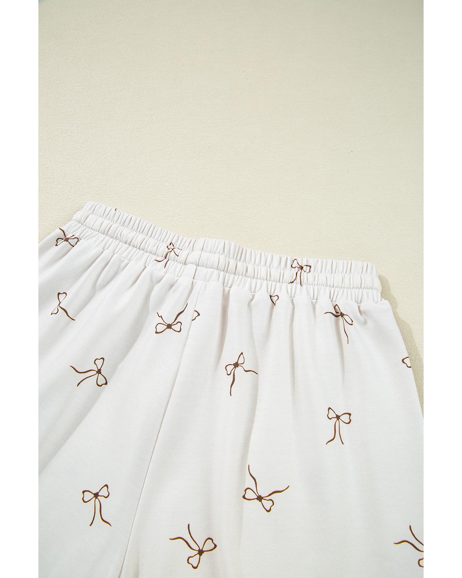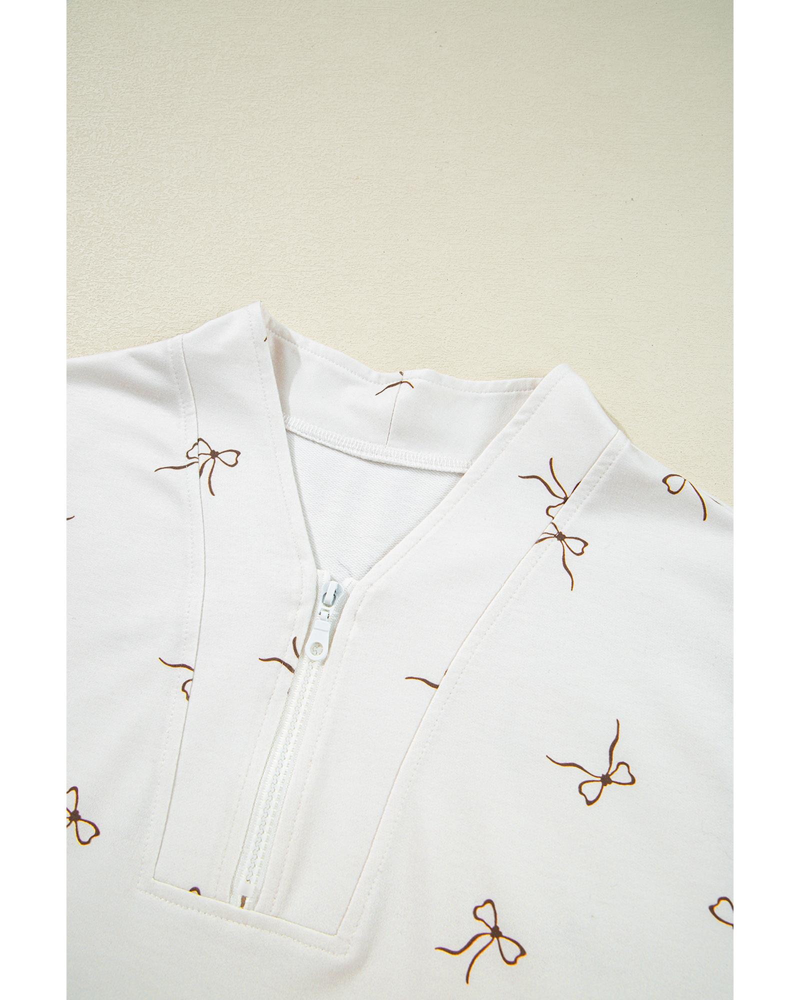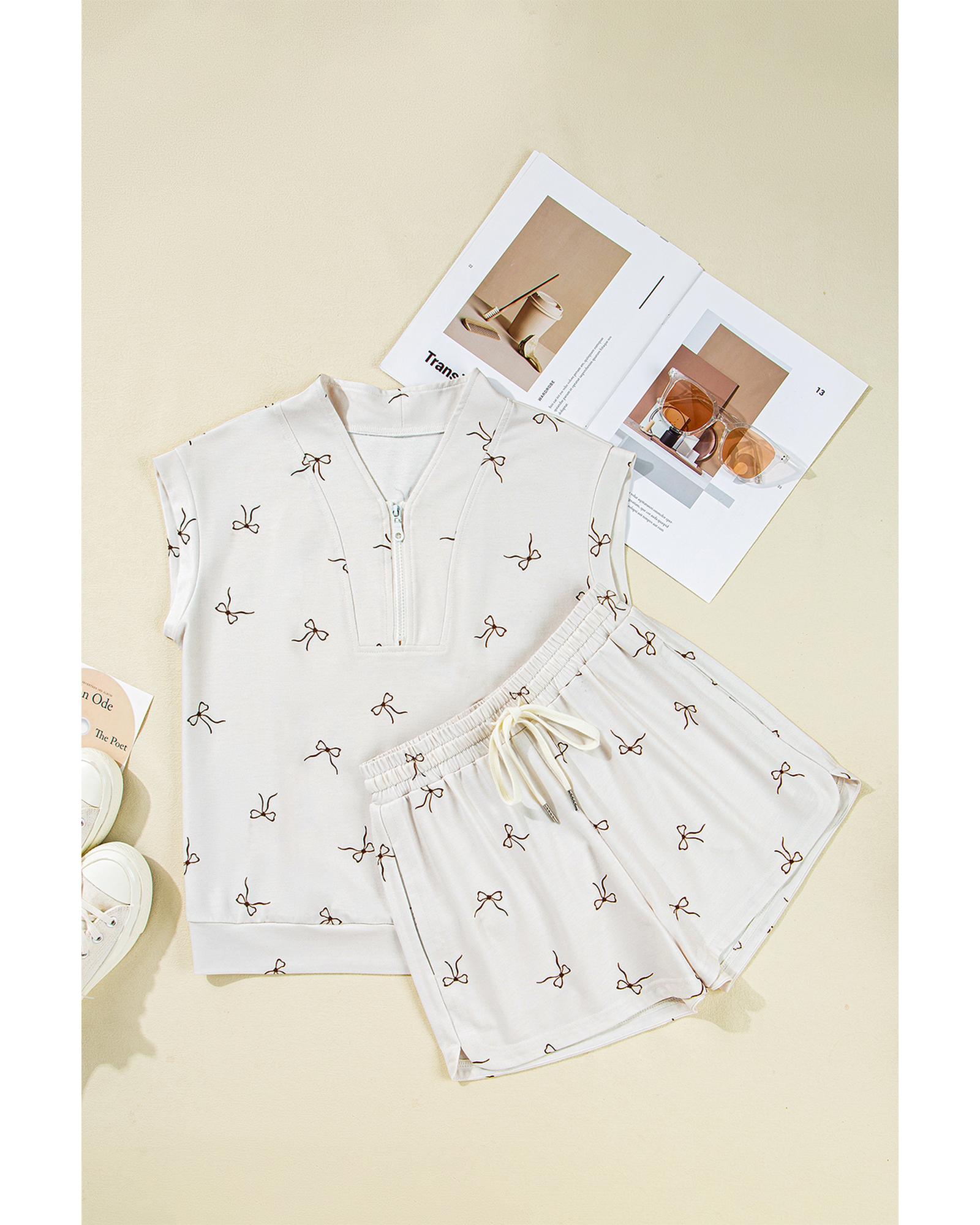 - Beige Bow Print Half Zip Tank and Shorts 2pcs Set