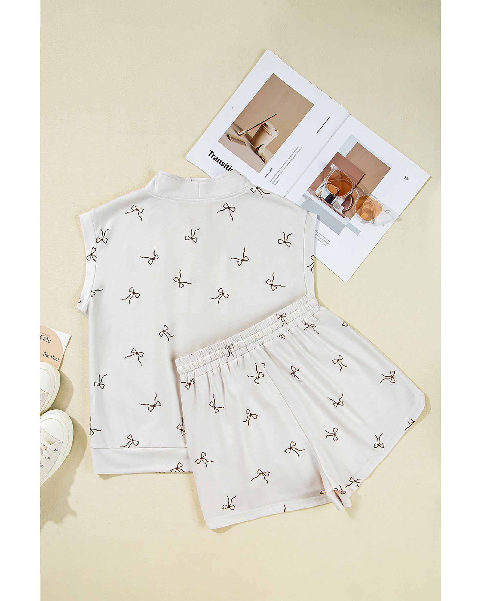 - Beige Bow Print Half Zip Tank and Shorts 2pcs Set