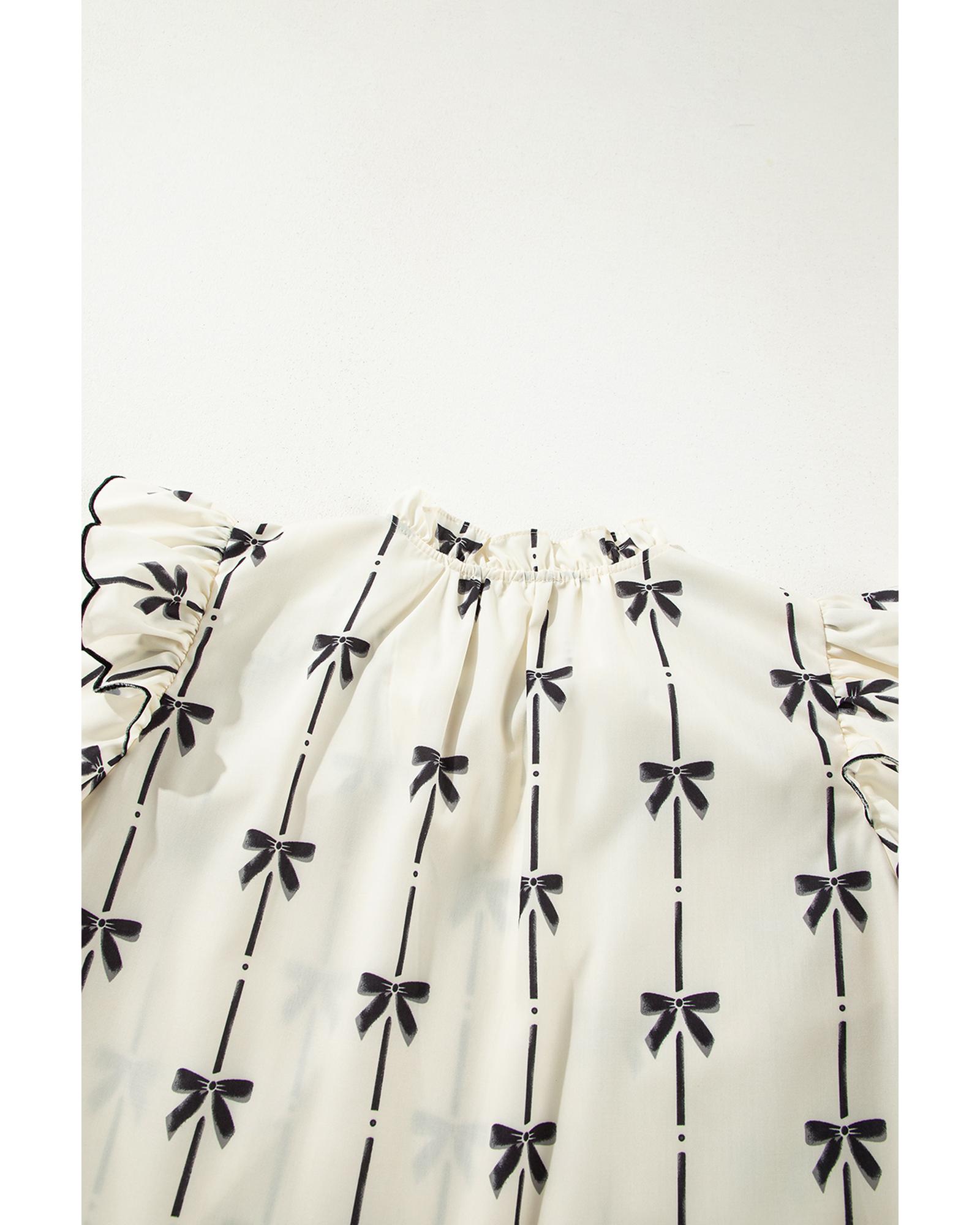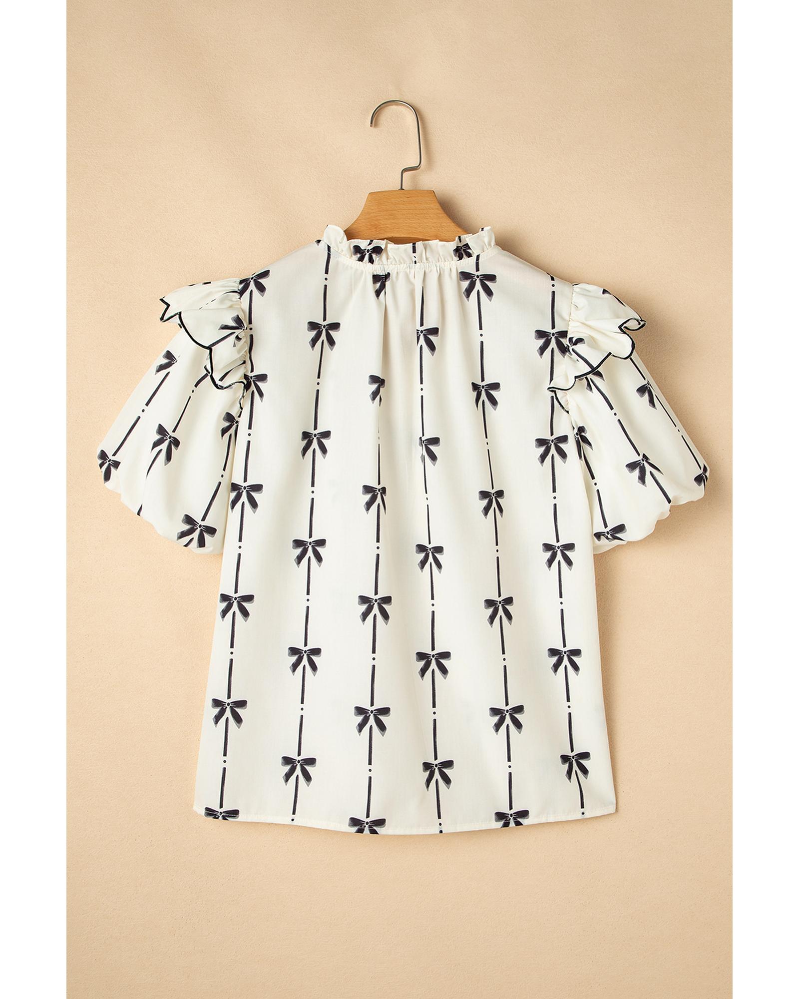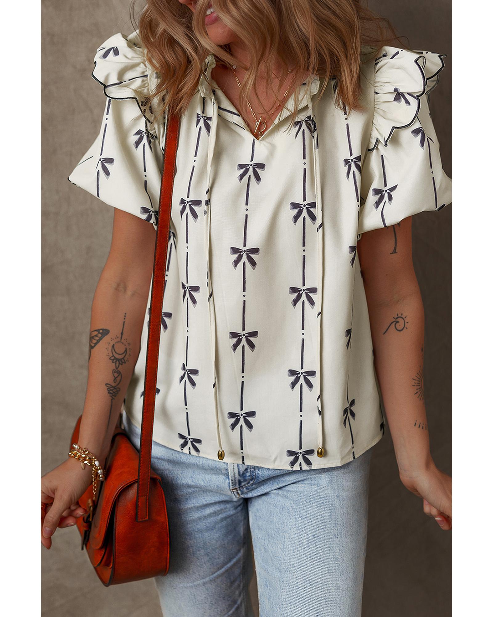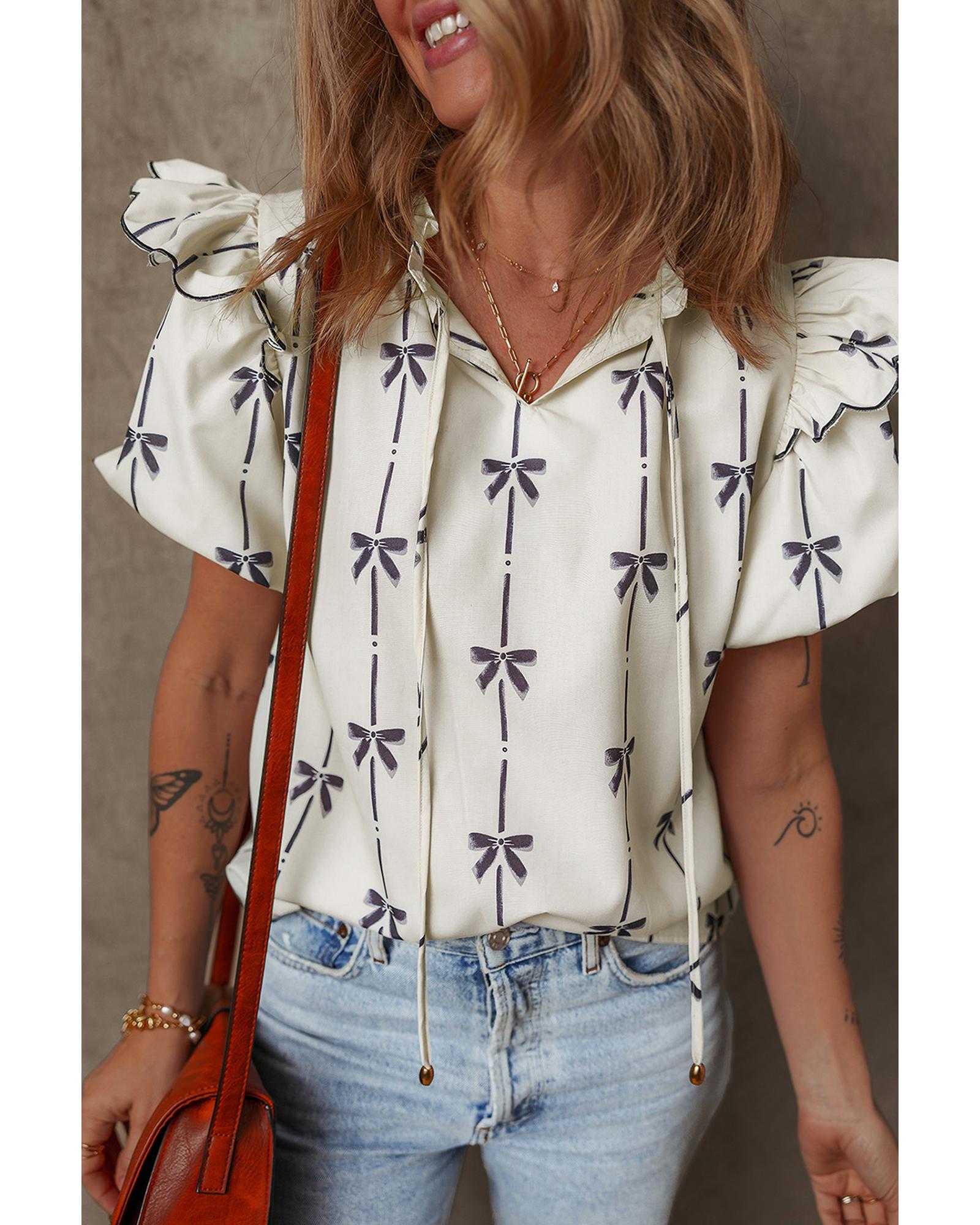Beige Bow Printed Ruffled Bubble Sleeve Tied Notched V Neck Blouse – L